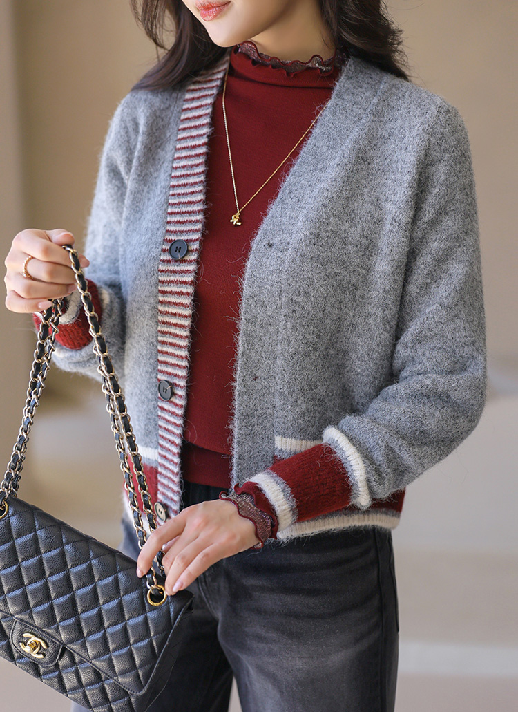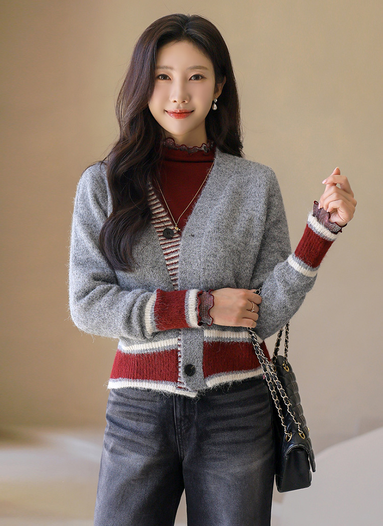 포근한 울 블렌딩 소재에 세련된 배색 디자인이 돋보이는 니트 가디건이에요 :)