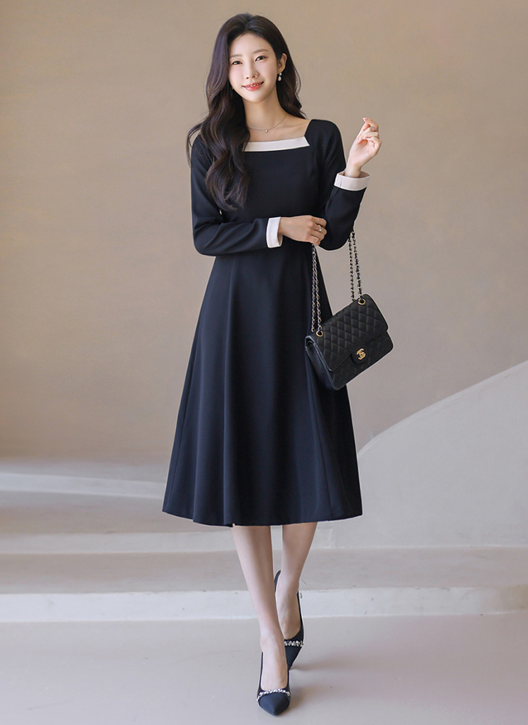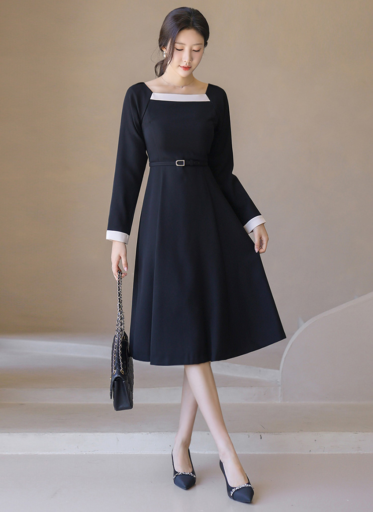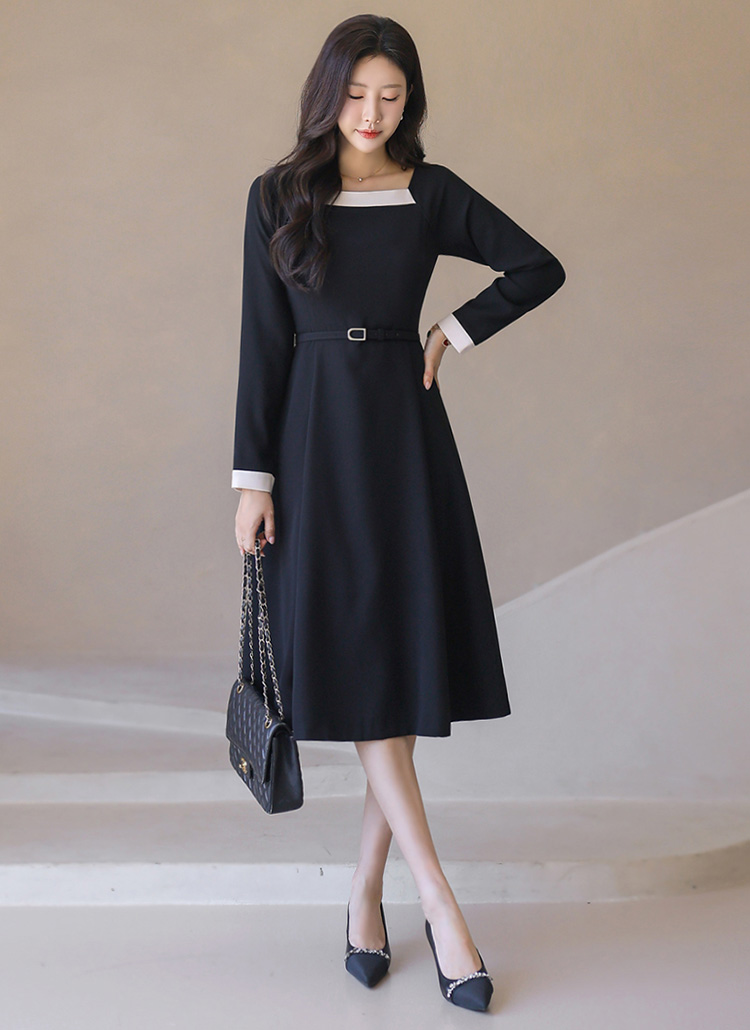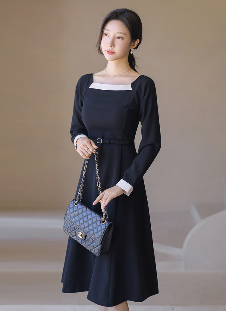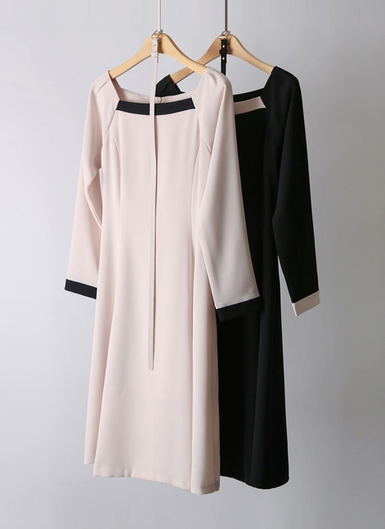 벨지엔 배색 라인 스퀘어 넥 벨트SET A라인 플레어 롱 원피스
