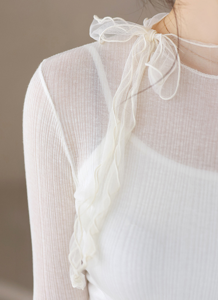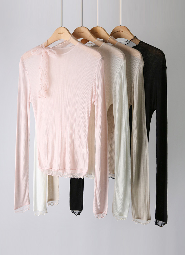 시스루 레이스 배색과 넥라인 리본 디테일로
