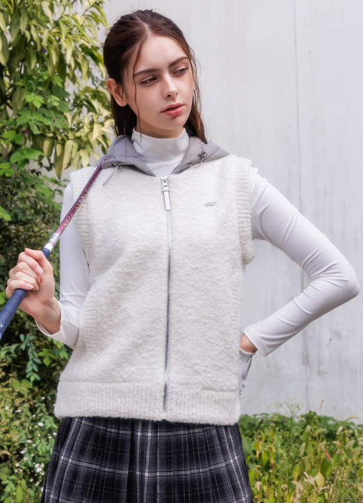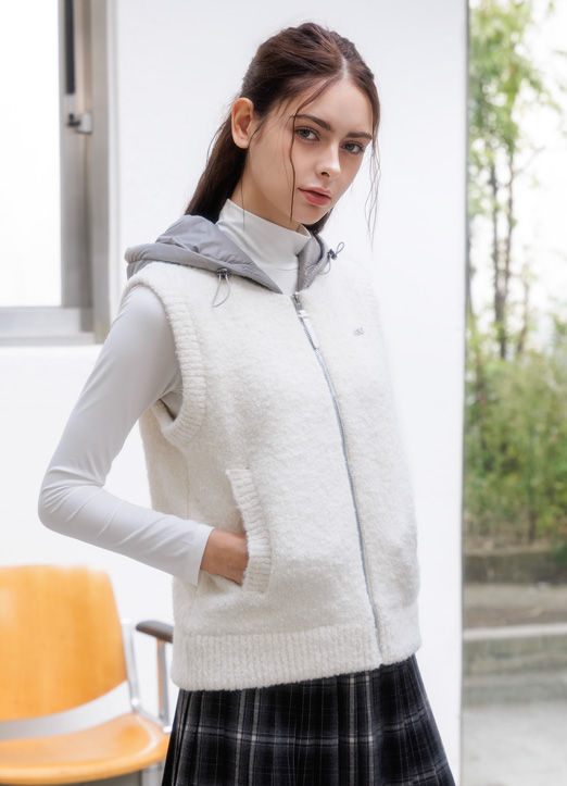 울 혼방 부클 원사로 포근한 착용감을 선사하는 니트 집업 조끼입니다.
