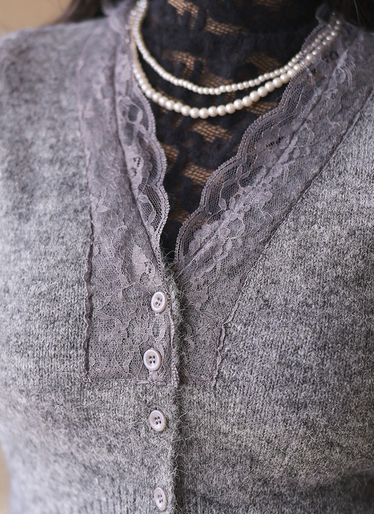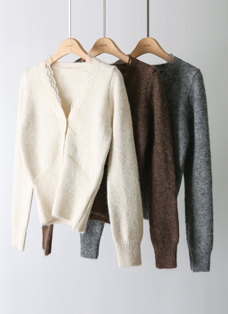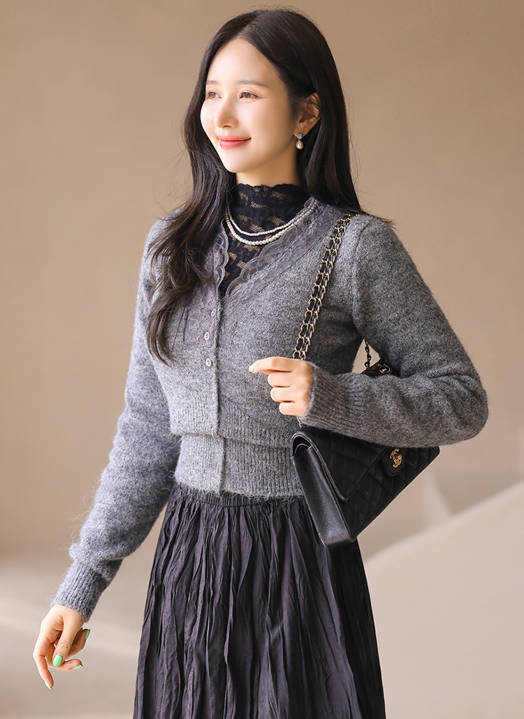 블라샤 레이스 배색 포근 울 블렌딩 헤어리 니트 가디건