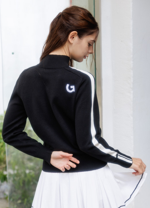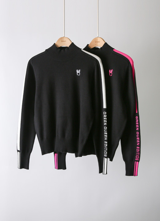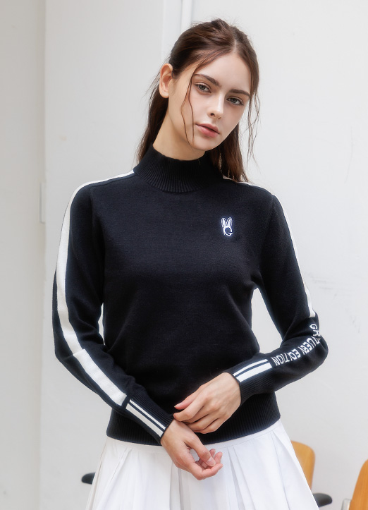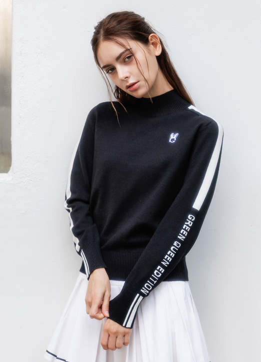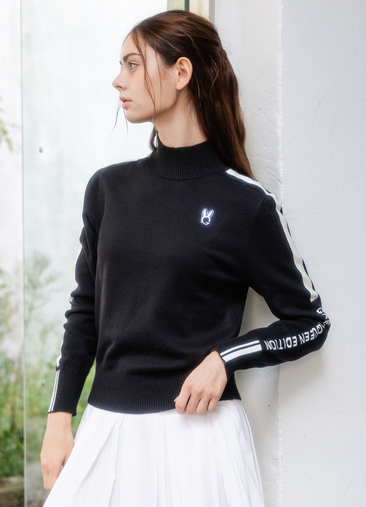 심플한 블랙 컬러에 화이트 라인 배색이 더해진 반목 니트입니다.