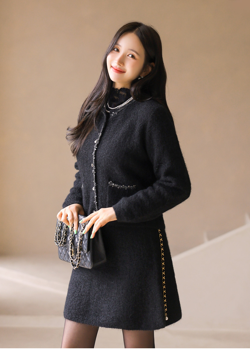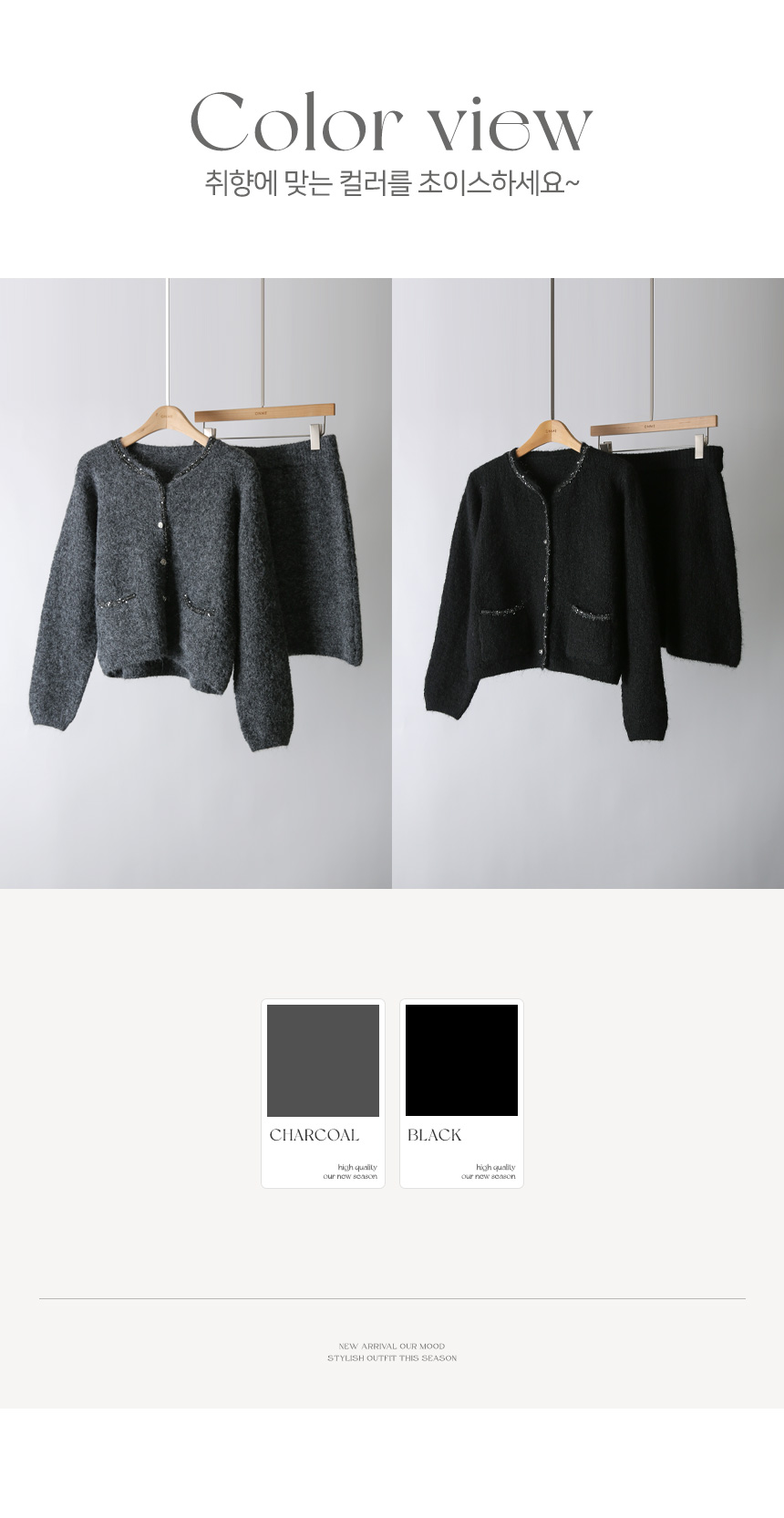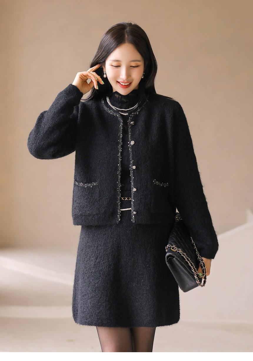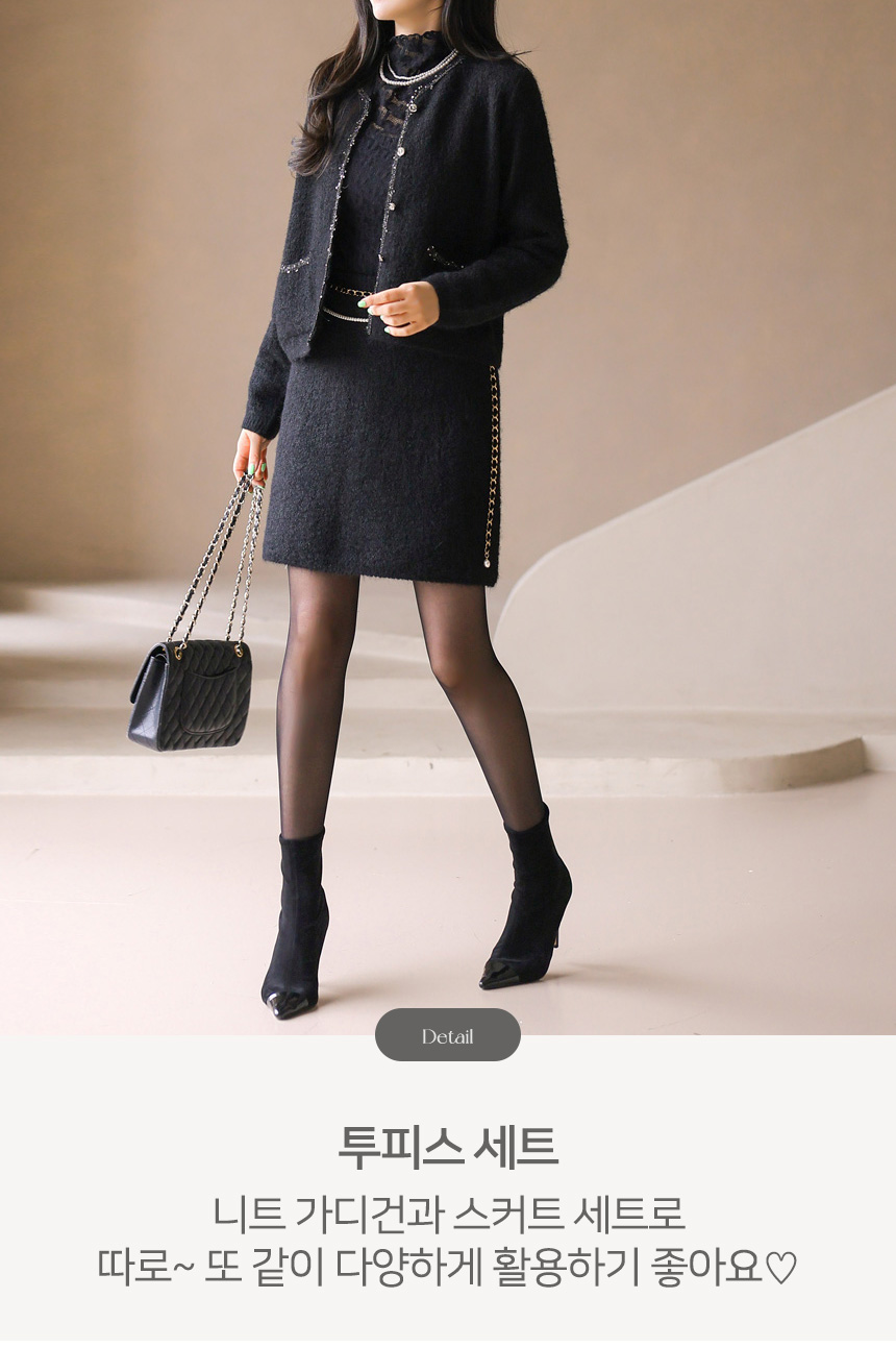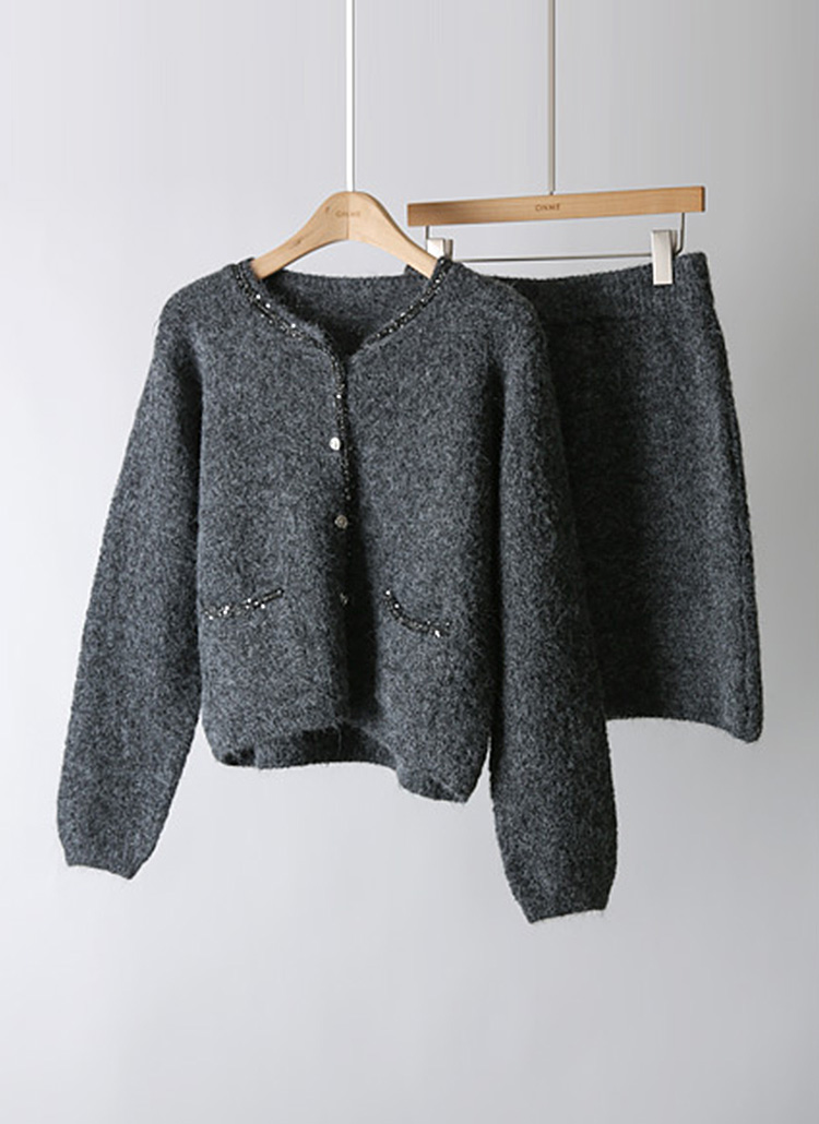 샤이닝 펄 스팽글 라인 배색 포근포근 니트 가디건 스커트 투피스 세트