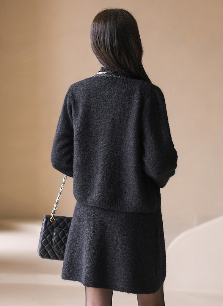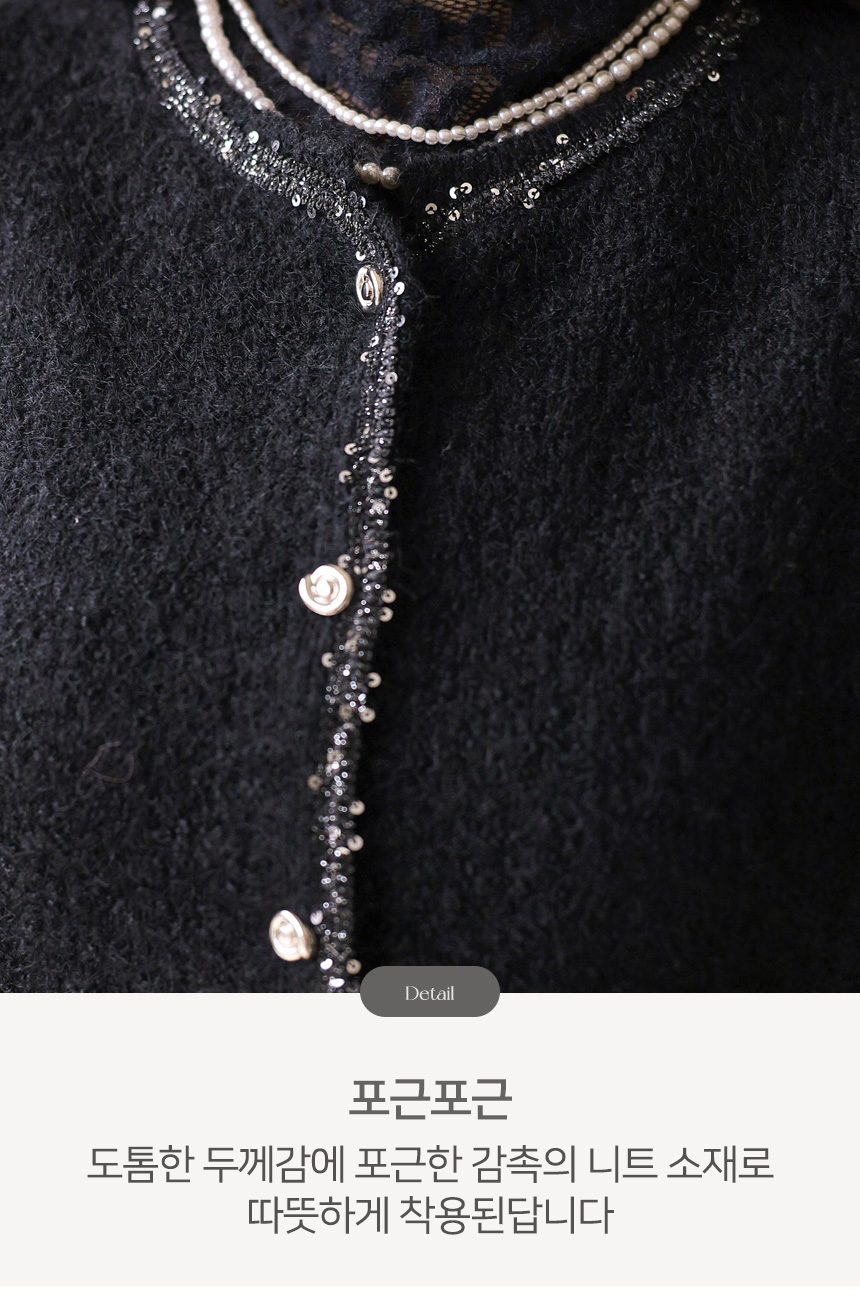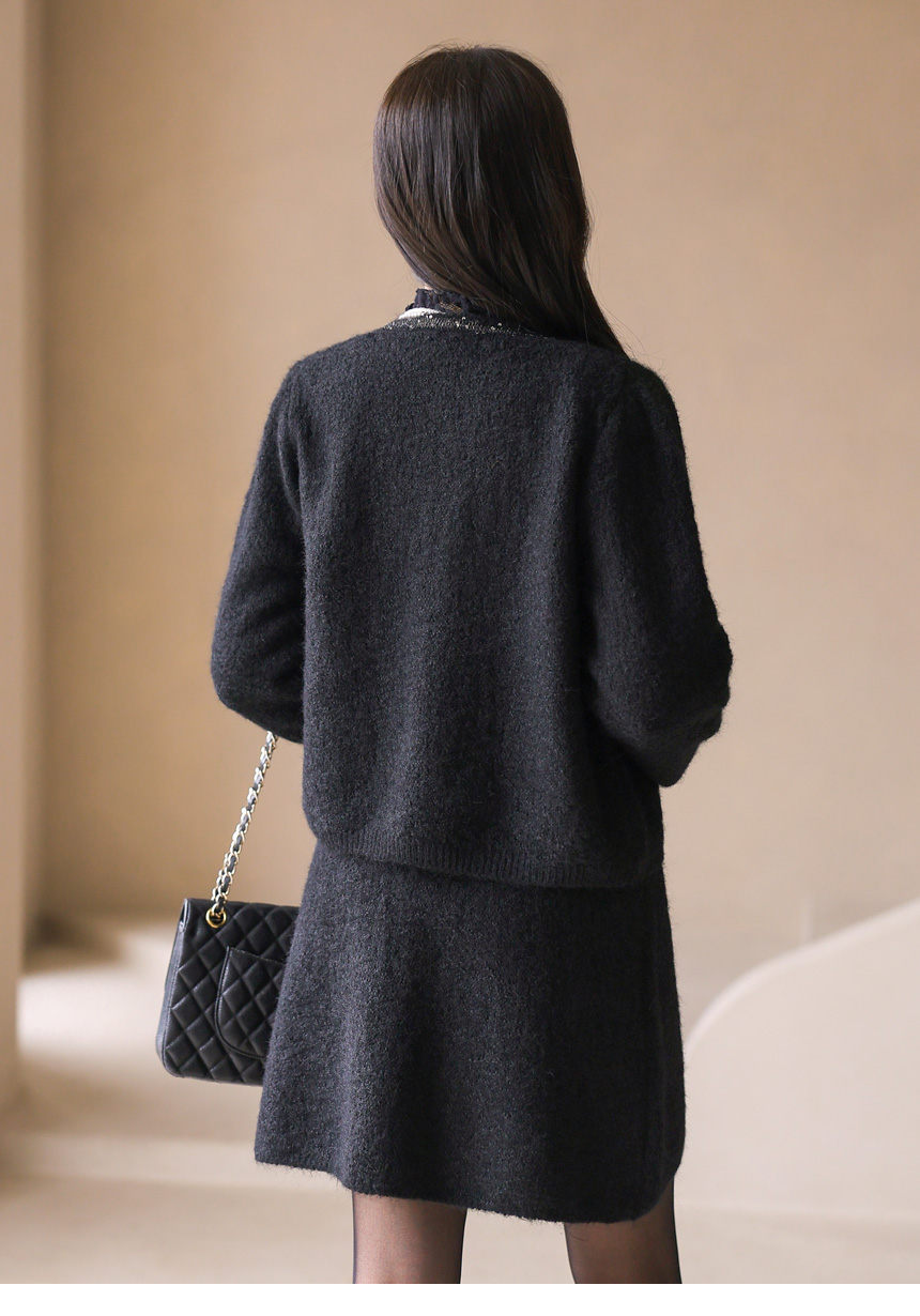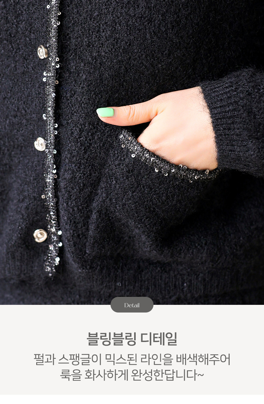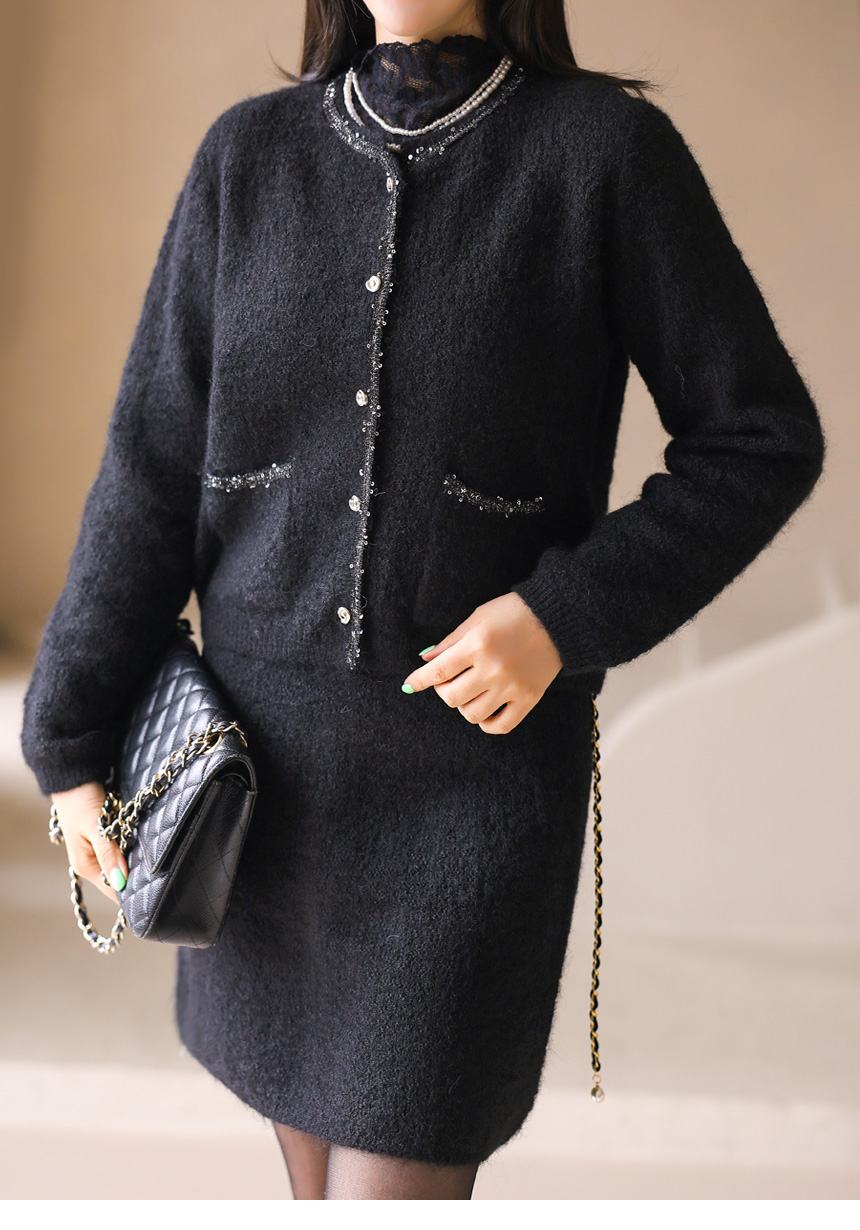 샤이닝 펄 스팽글 라인 배색 포근포근 니트 가디건 스커트 투피스 세트