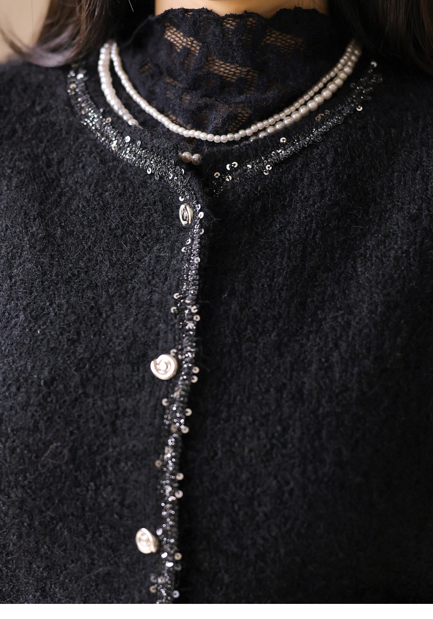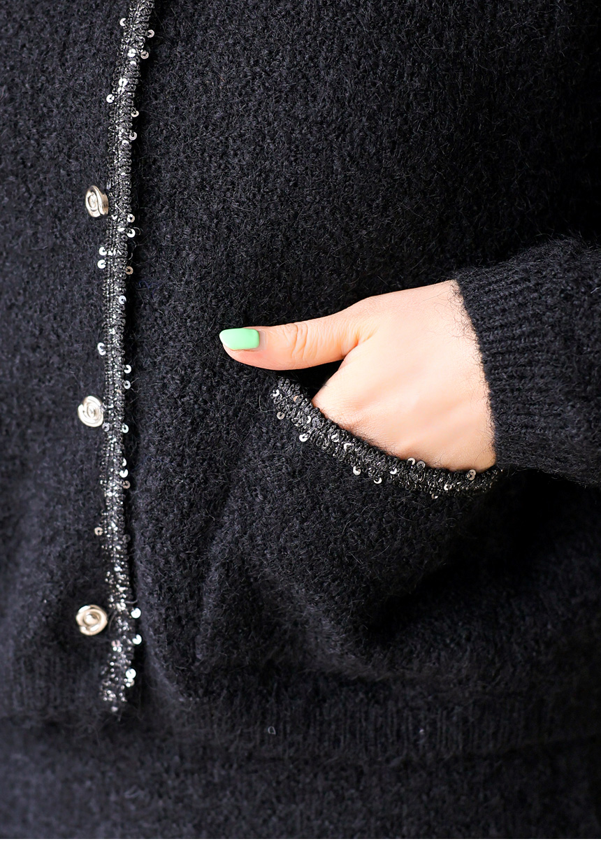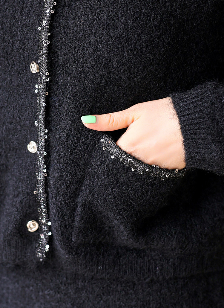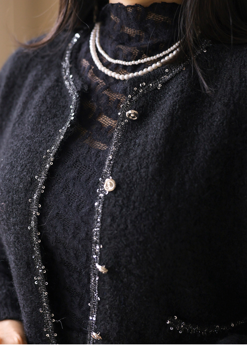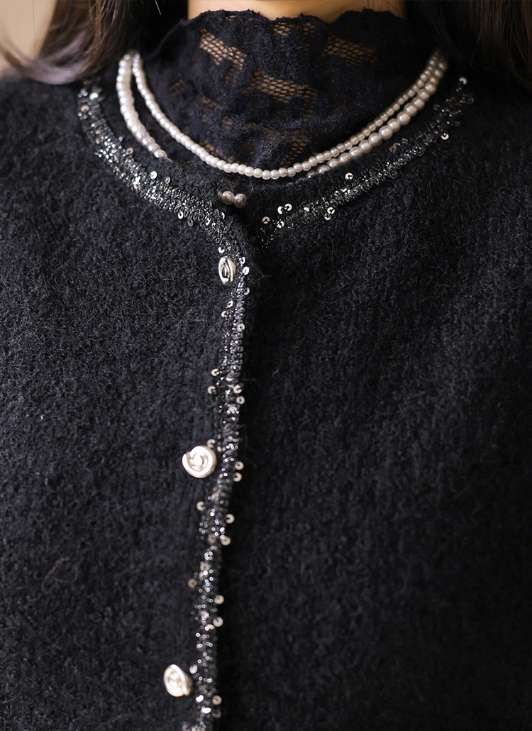 샤이닝 펄 스팽글 라인 배색 포근포근 니트 가디건 스커트 투피스 세트