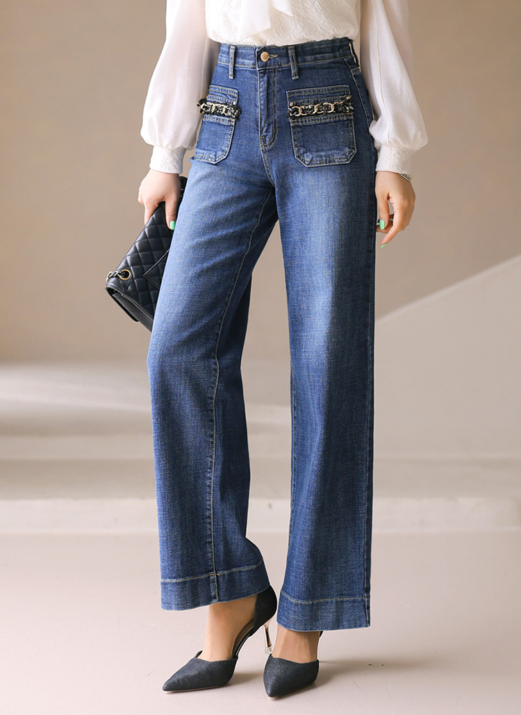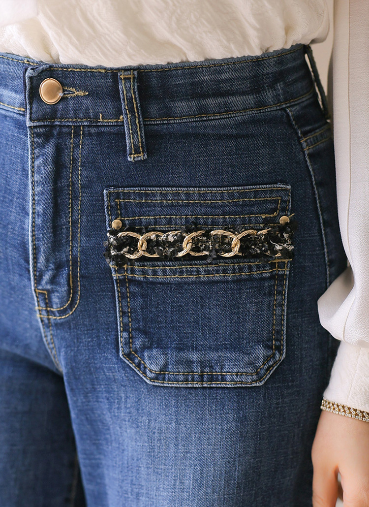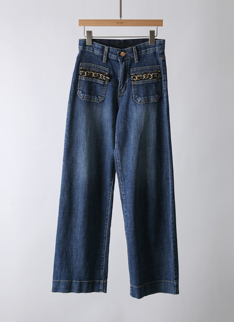 리치엔 시크 트위드 골드 체인 앞 포켓 세미 와이드 데님 팬츠