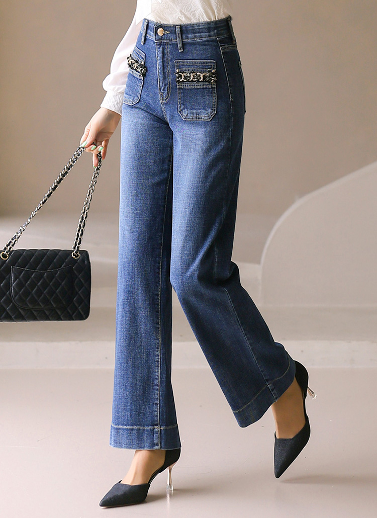 리치엔 시크 트위드 골드 체인 앞 포켓 세미 와이드 데님 팬츠