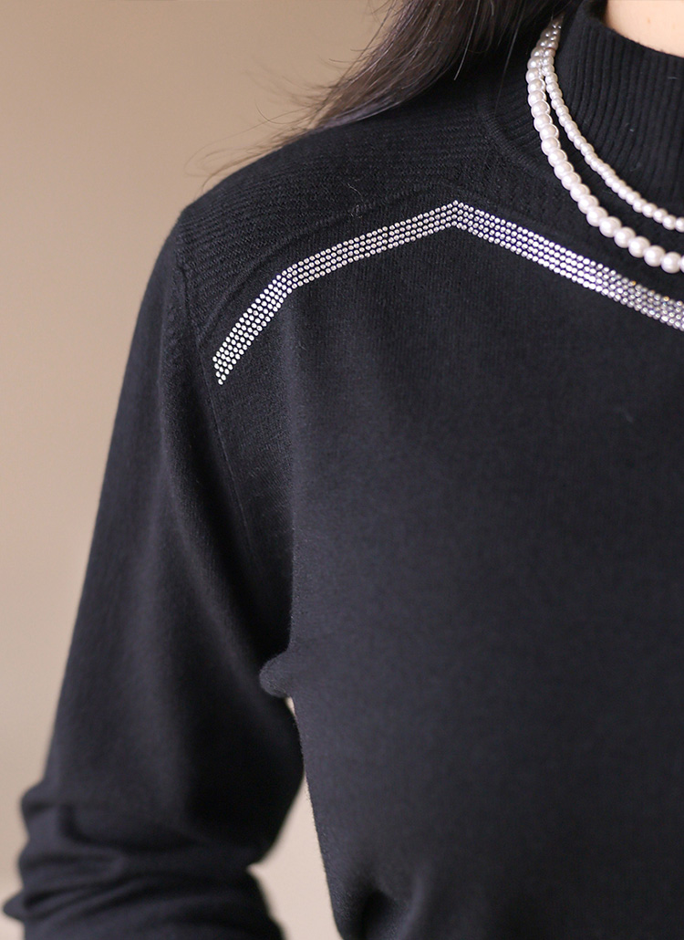 리블라 샤이닝 비즈 라인 숄더 골지 배색 반하이넥 니트