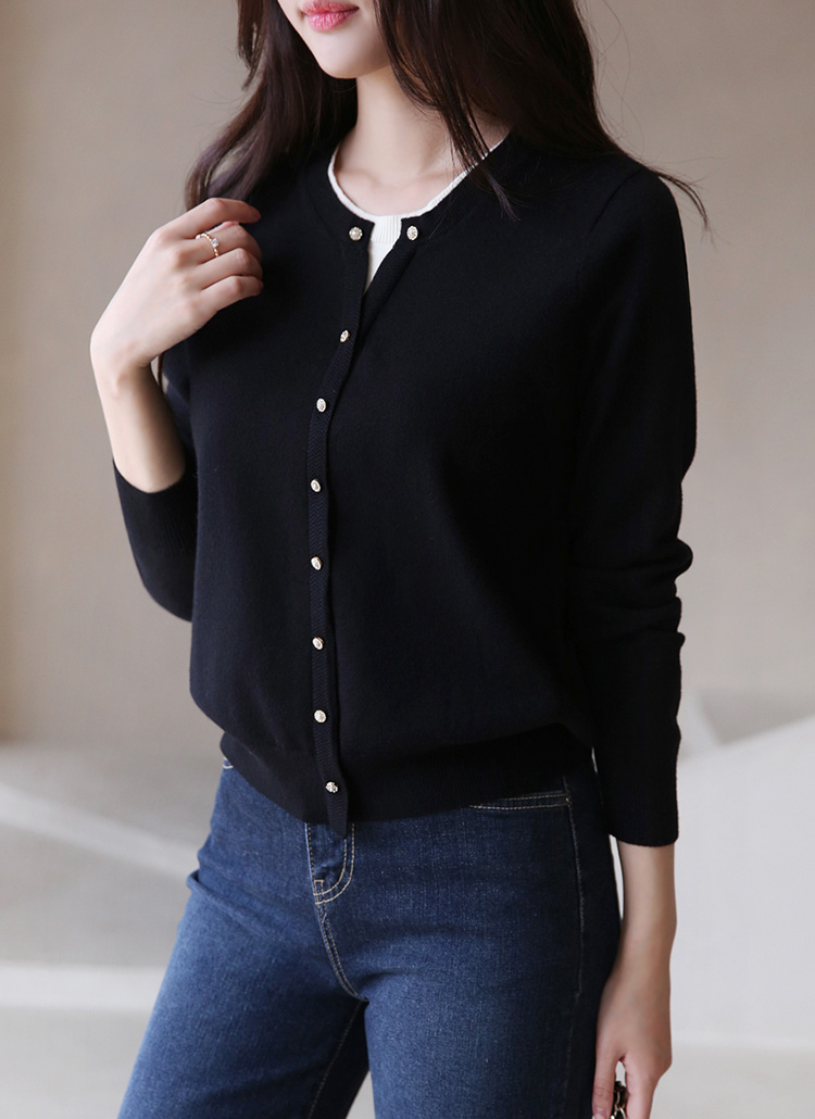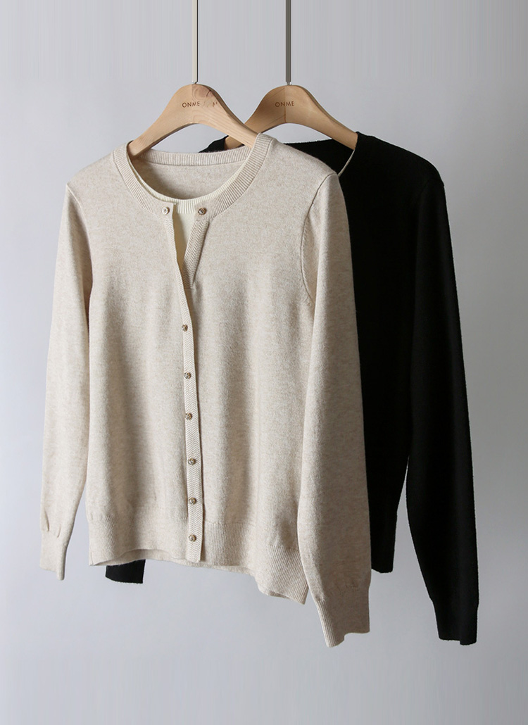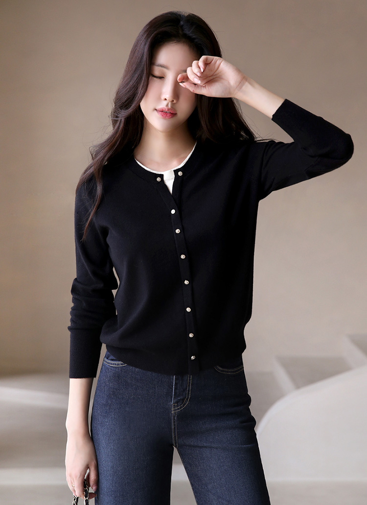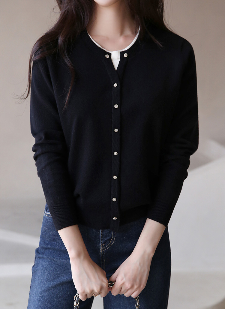 듀에르 V트임 배색 레이어드 쥬얼버튼 니트