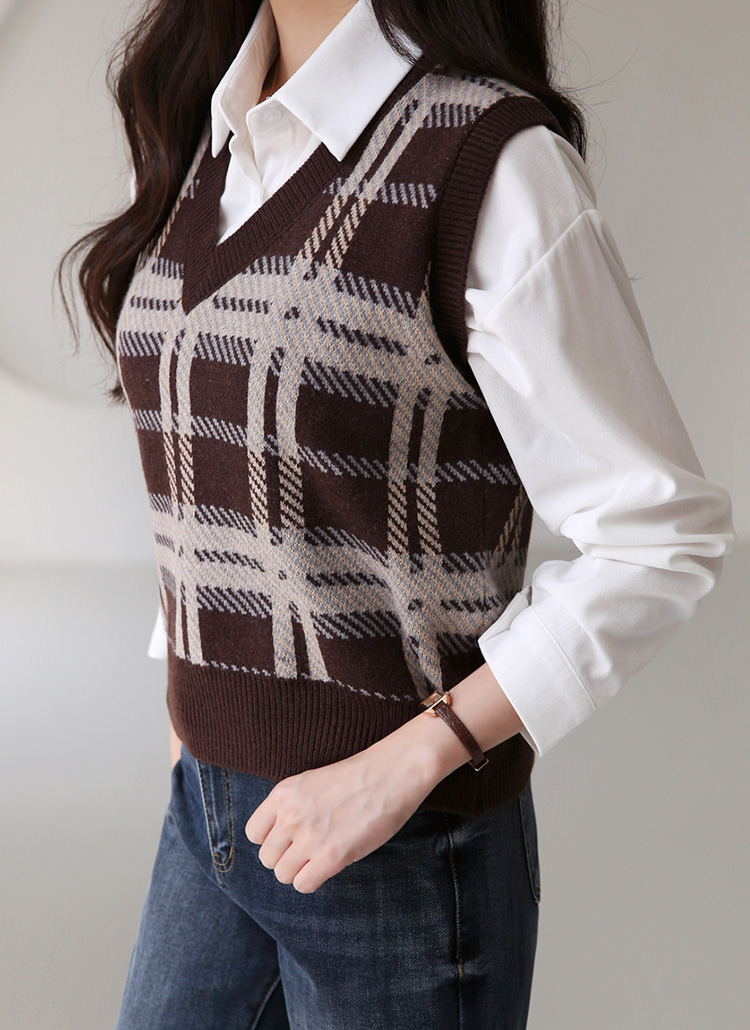 [세트] 브엔뉴 톡톡 셔츠&체크 브이넥 니트 베스트 투피스 세트