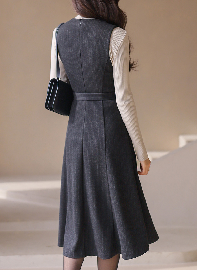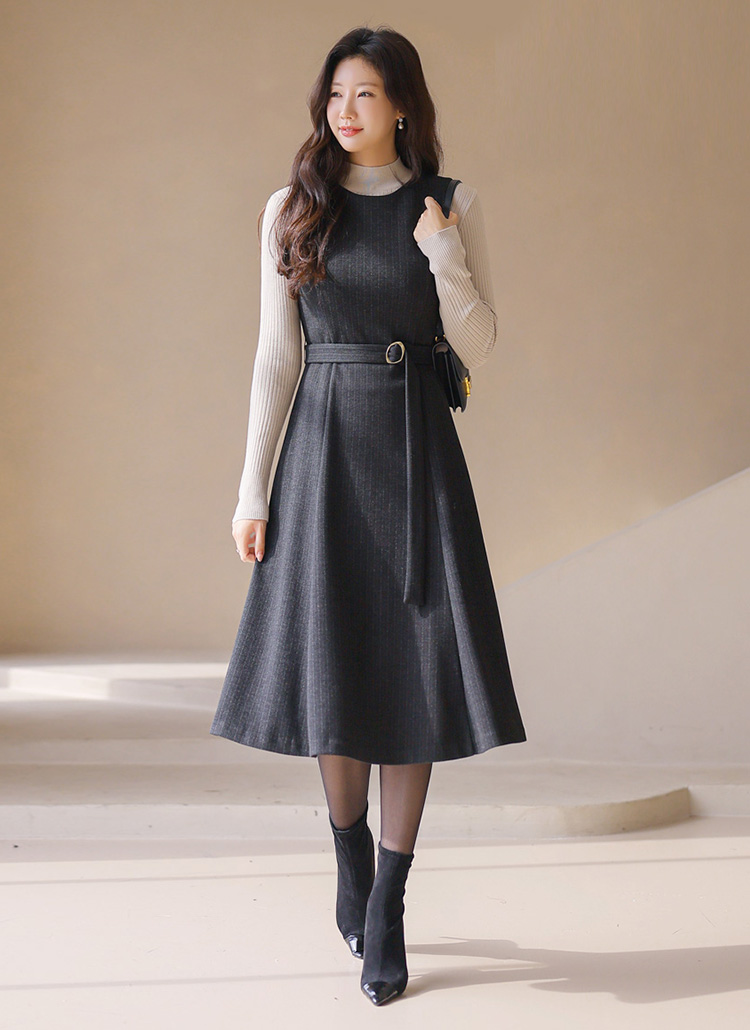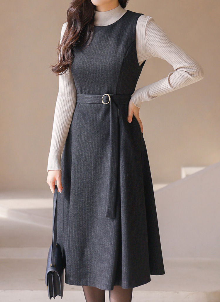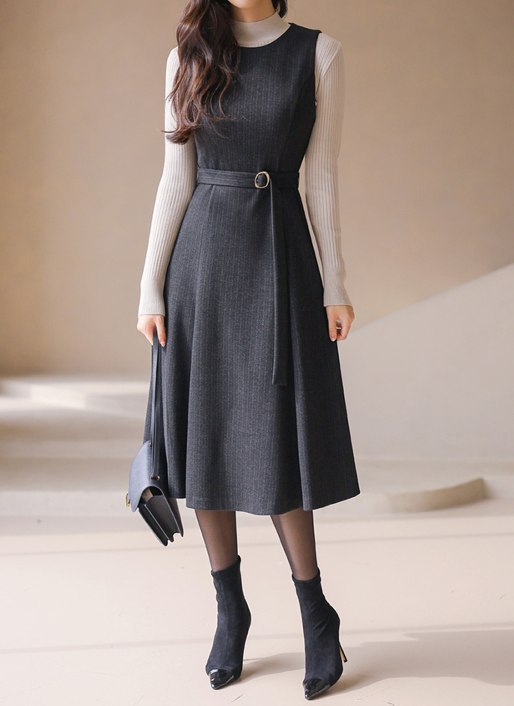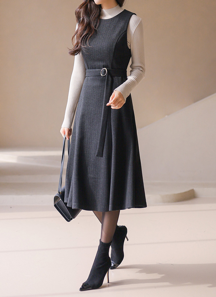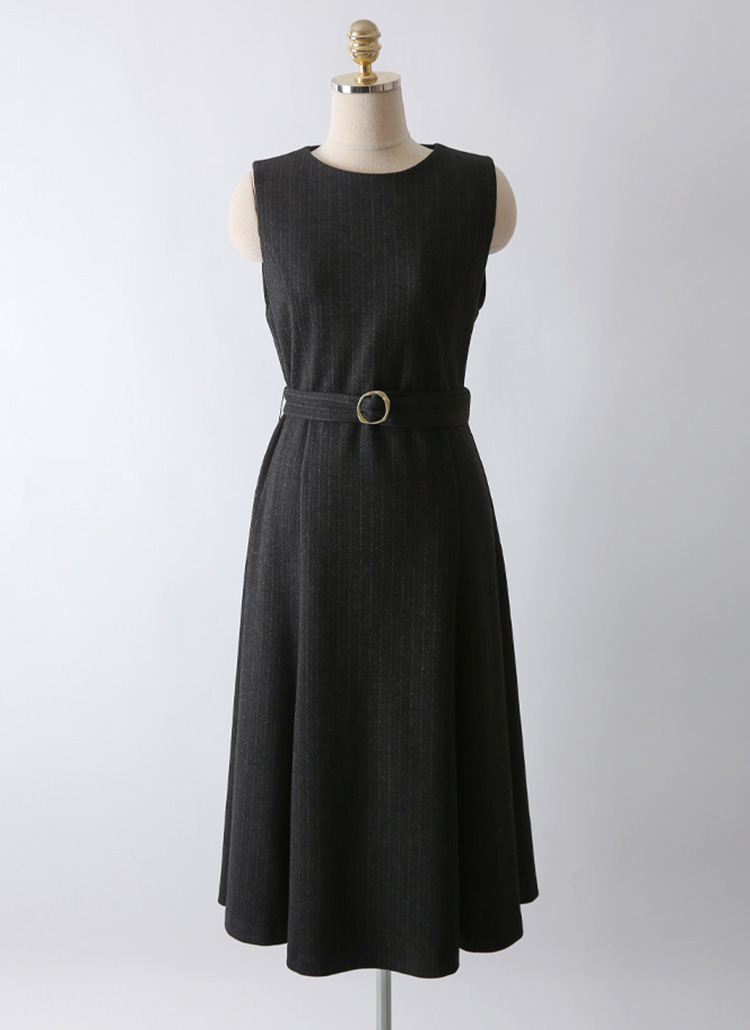 [LouisAngel] 세리아 버클 벨티드 A라인 플레어 스트라이프 뷔스티에 원피스