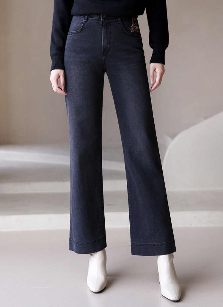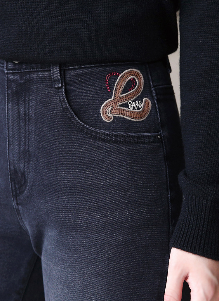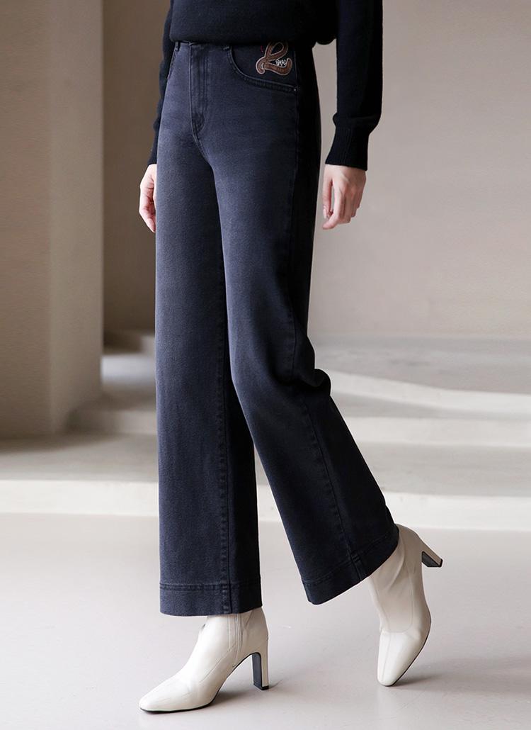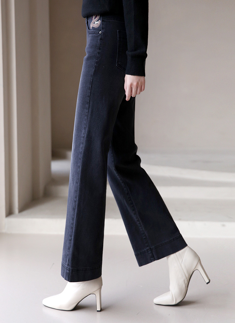 러브 레더패치 자수 히든밴딩 일자와이드 데님 팬츠