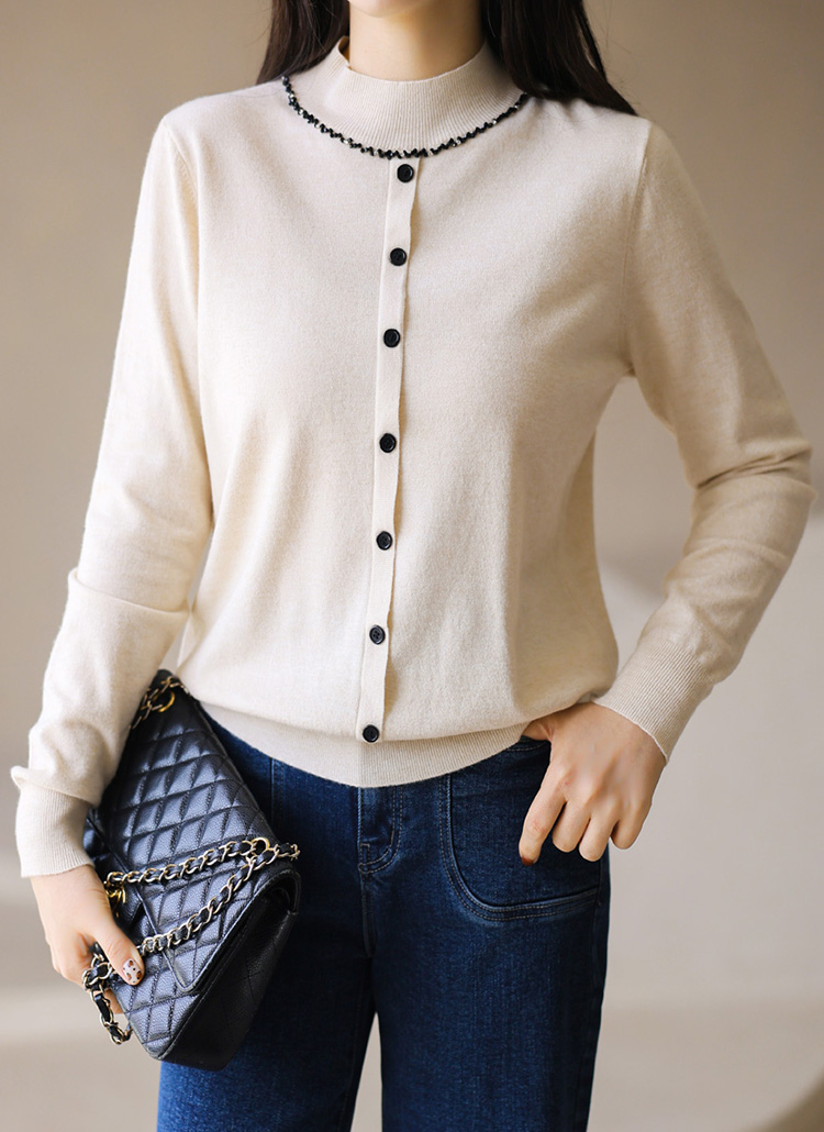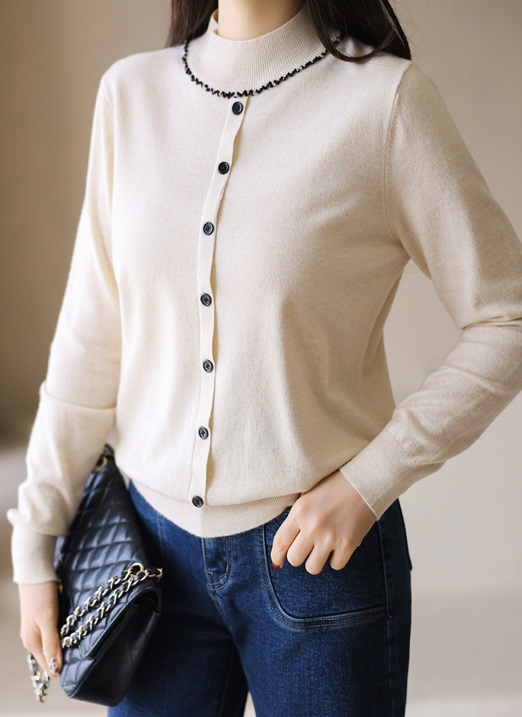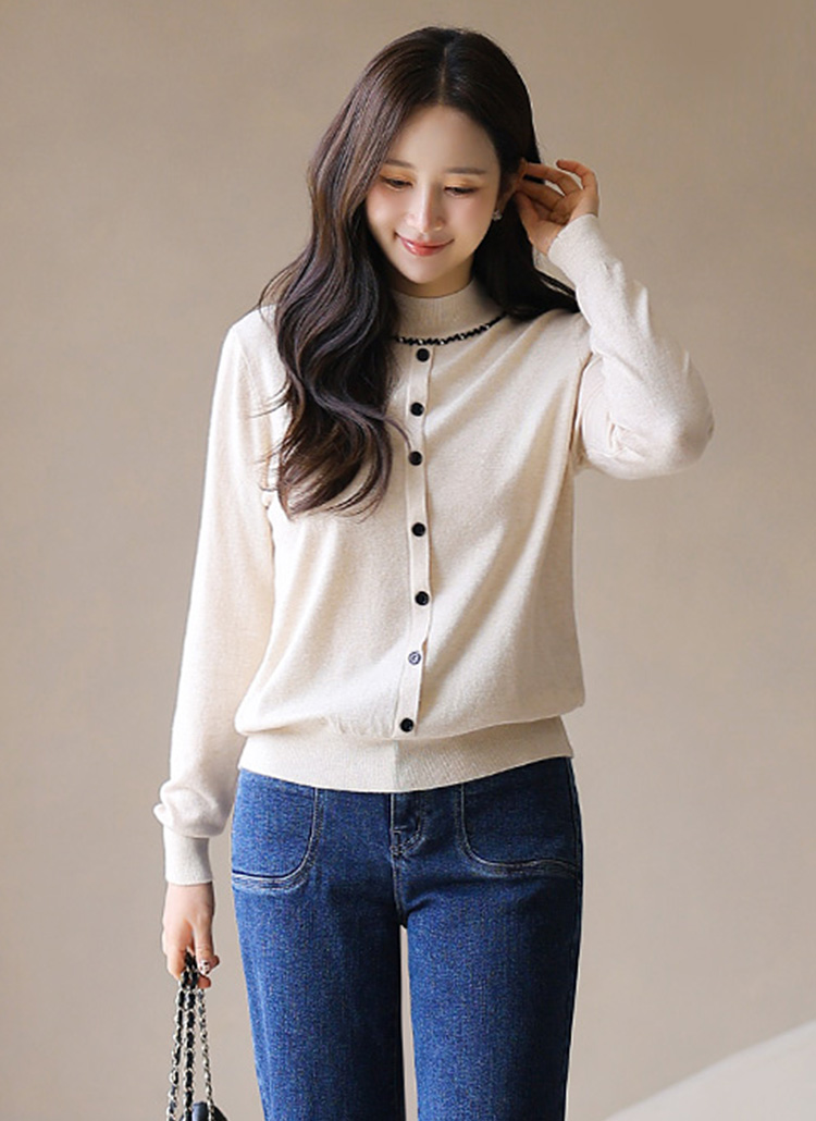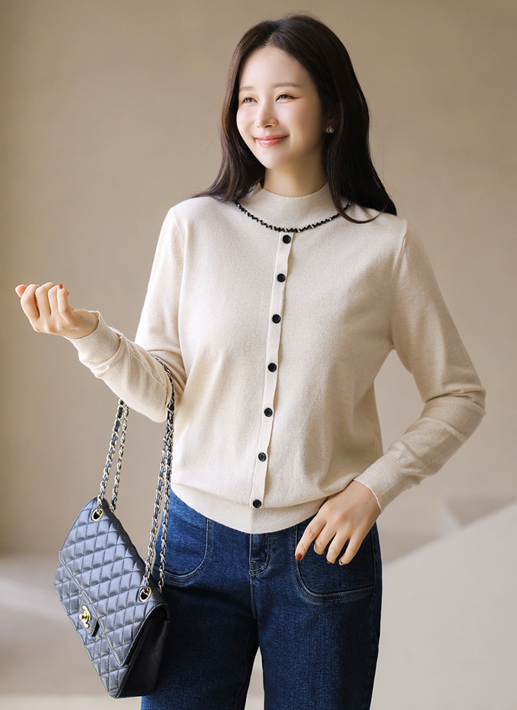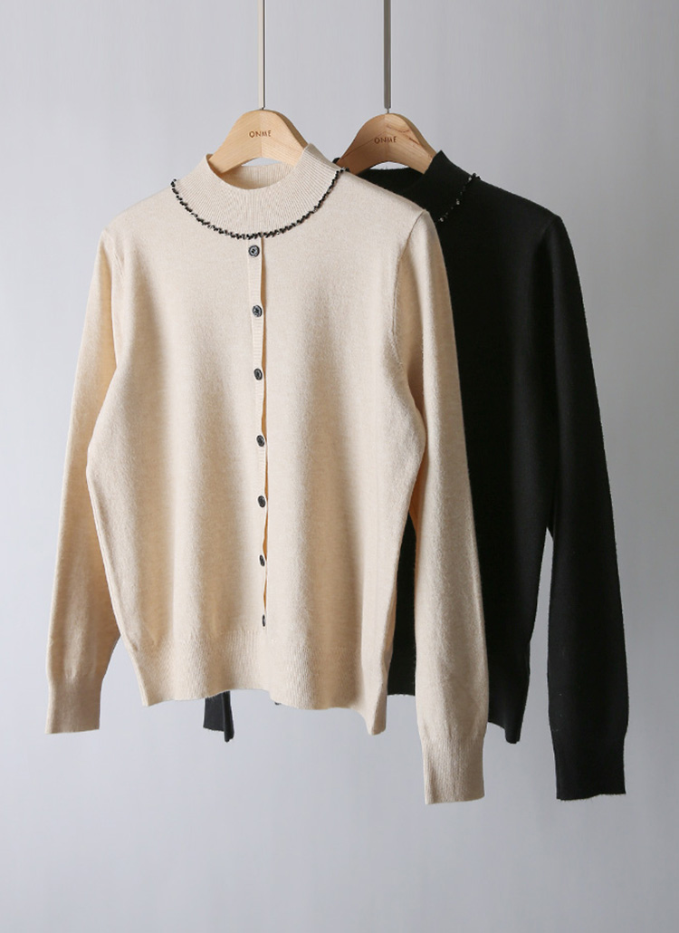 엔블라 큐빅 비즈 라인 반하이넥 버튼 니트