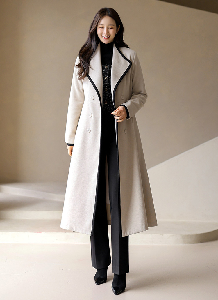 라인 배색 디테일과 골드 버클 벨트 SET로 고급스러움을 더한 더블 롱 코트에요 :)