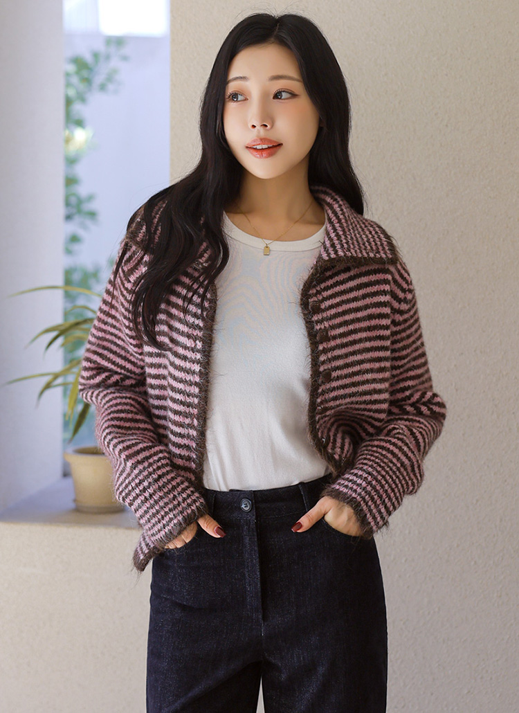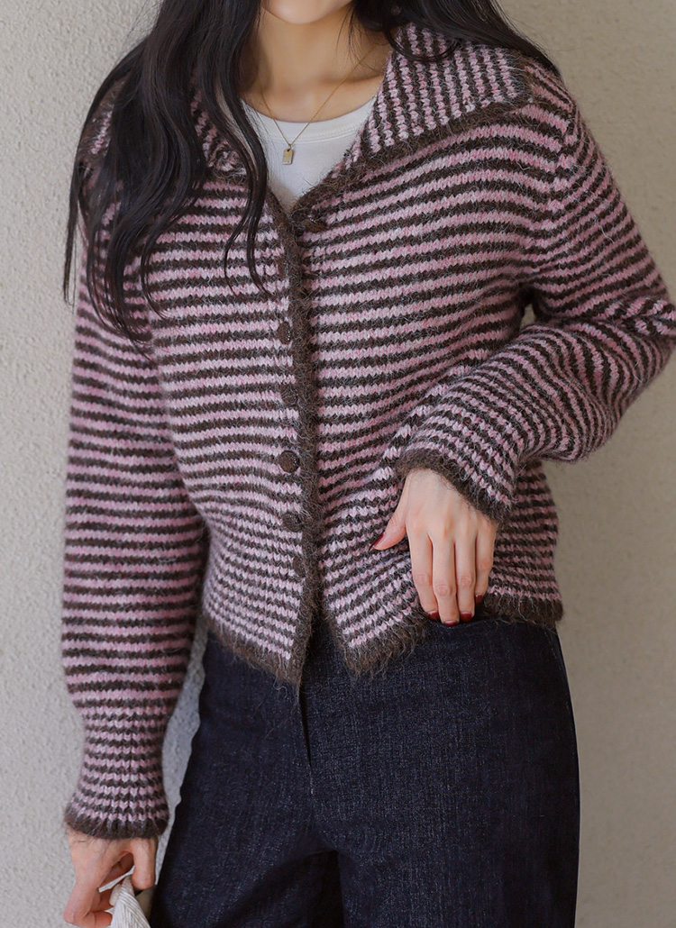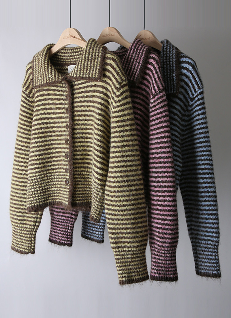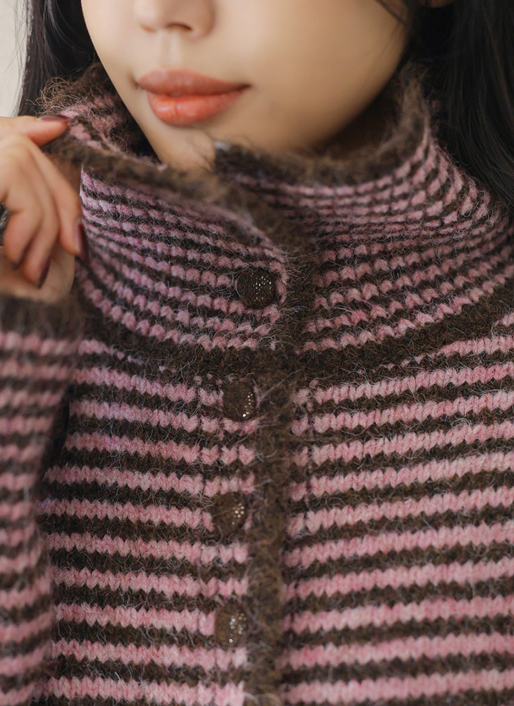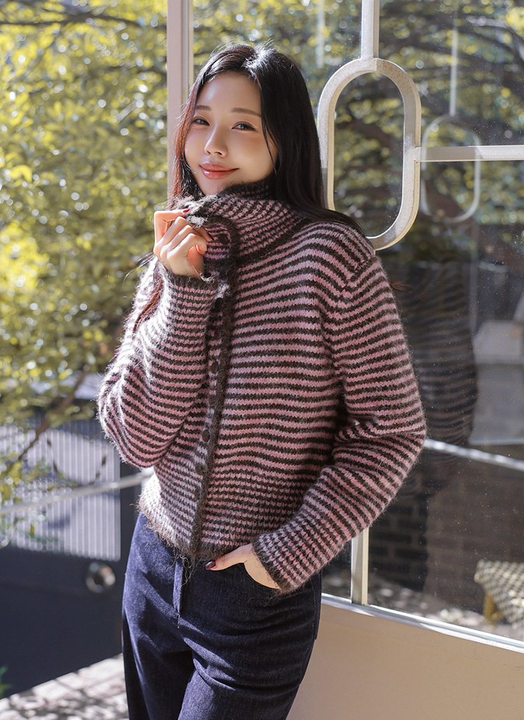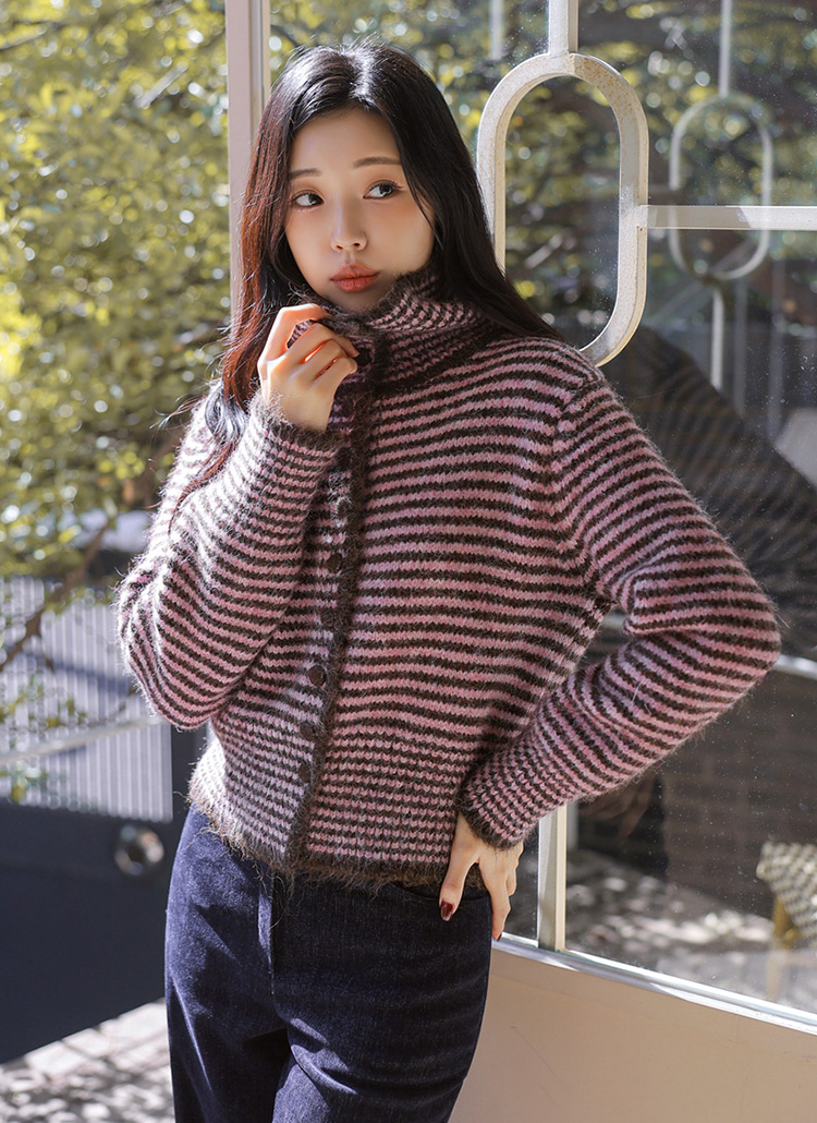 [Theonme] 하웰 배색 스트라이프 헤어리 울 하이넥 카라 니트 가디건