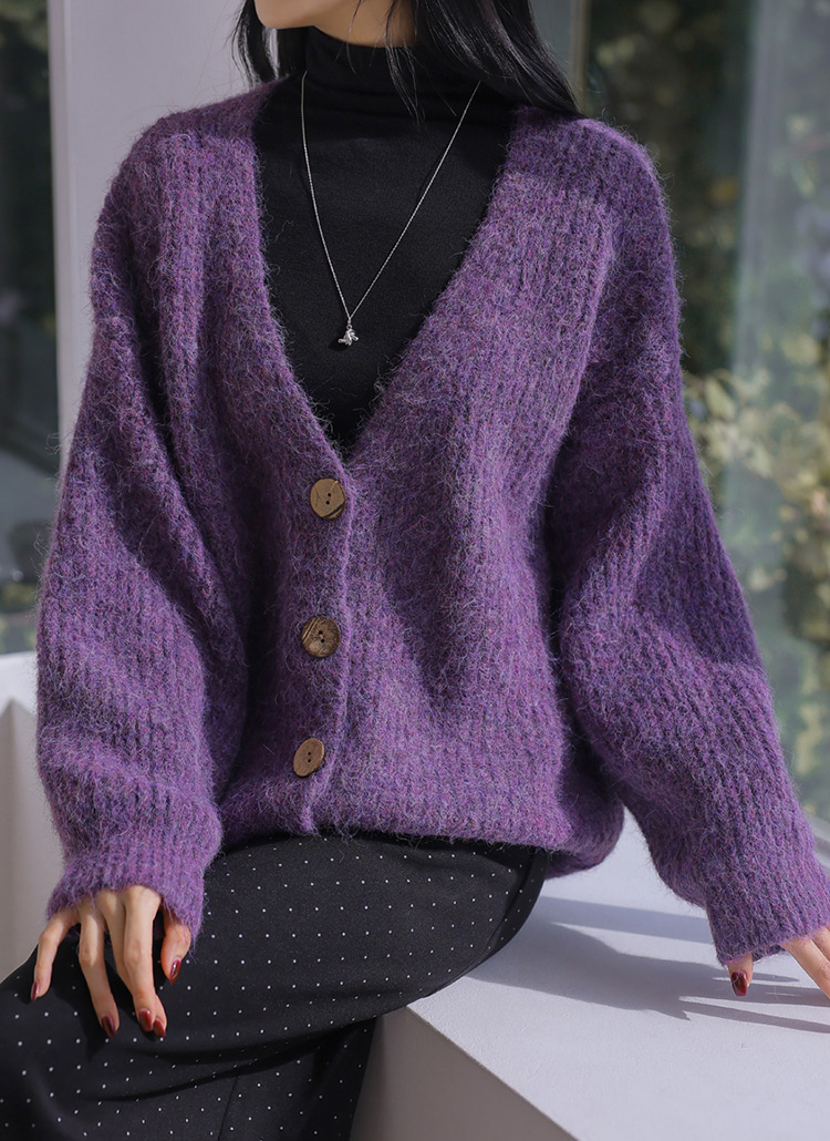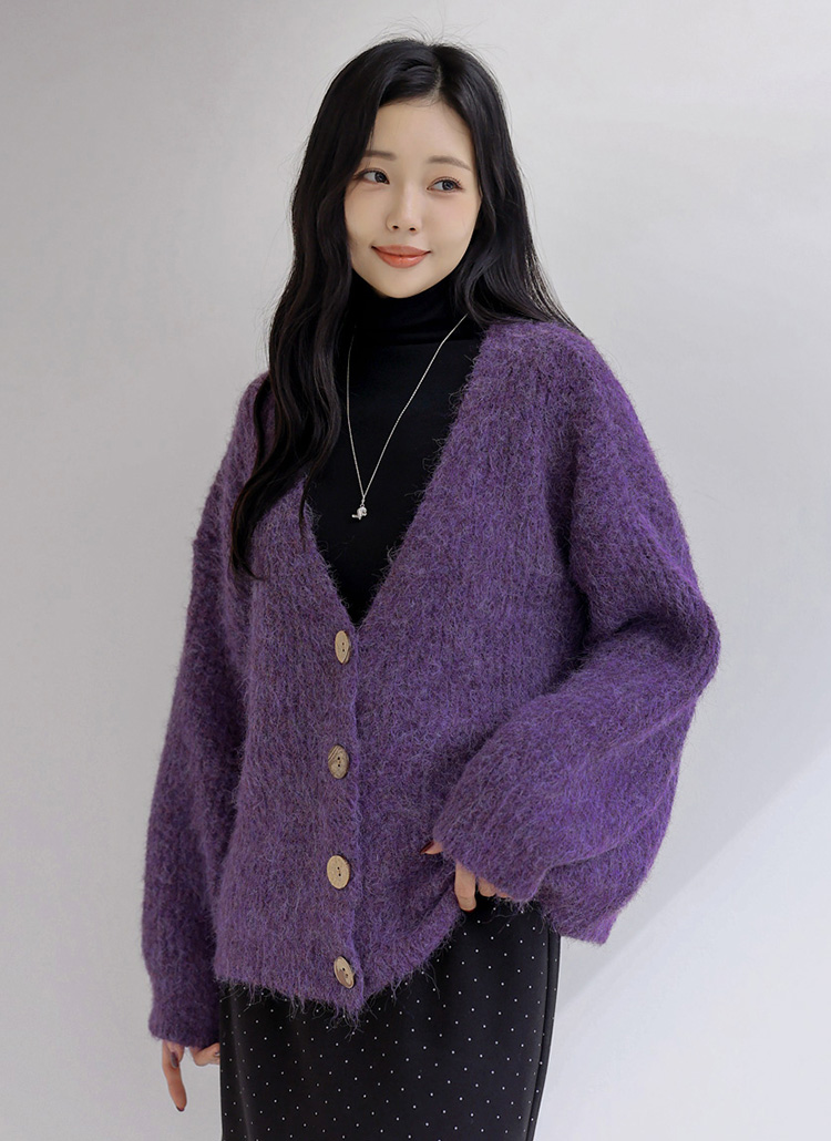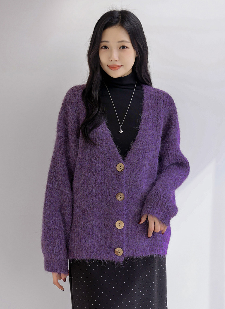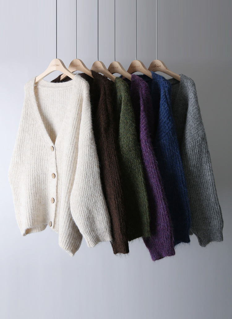 [Theonme] 에비즈 헤어리 울 우드버튼 루즈핏 브이넥 니트 가디건