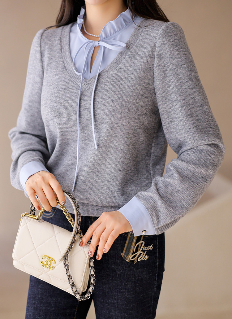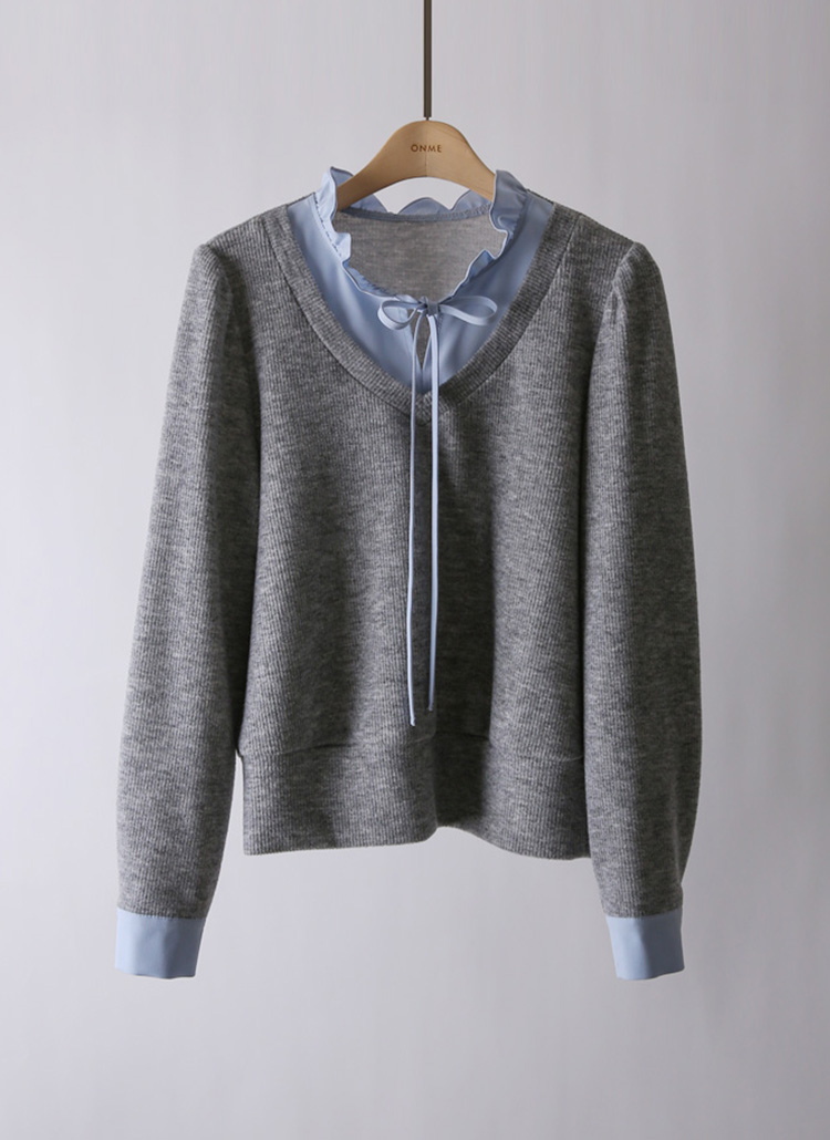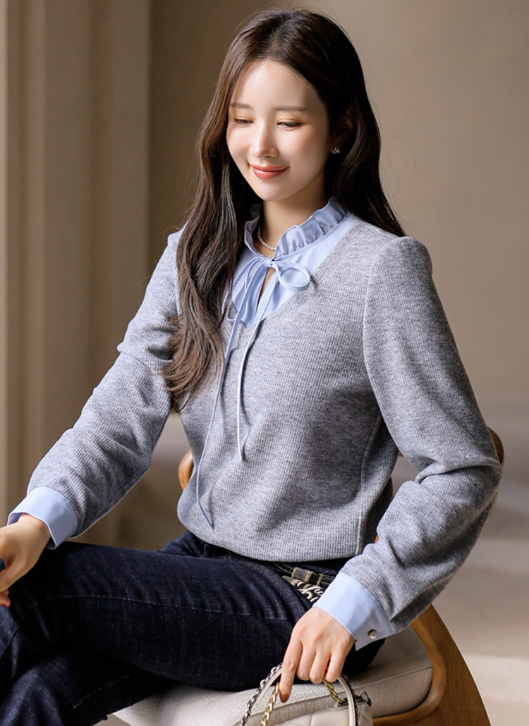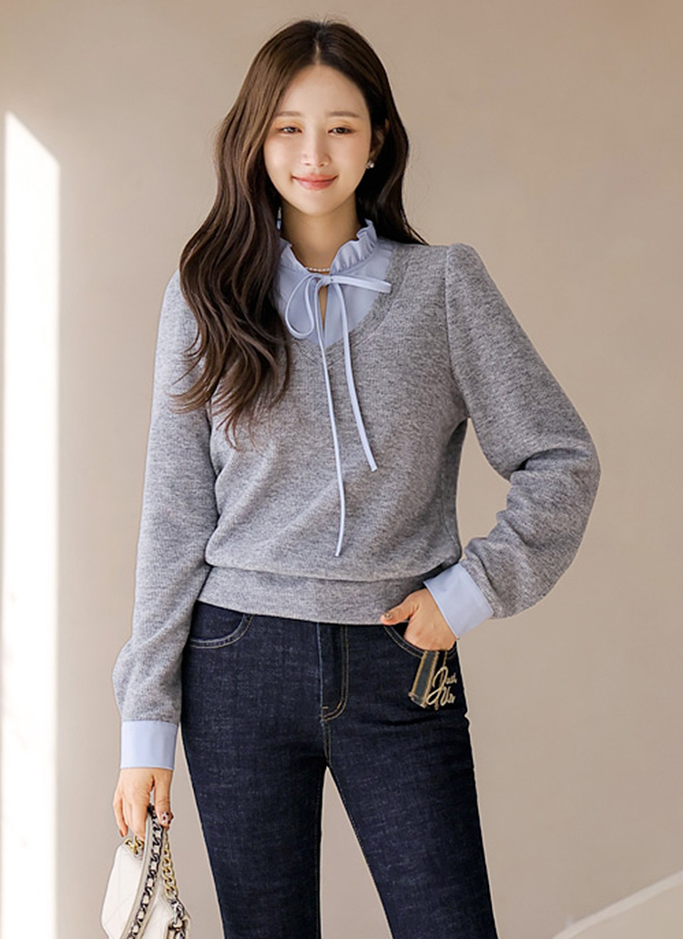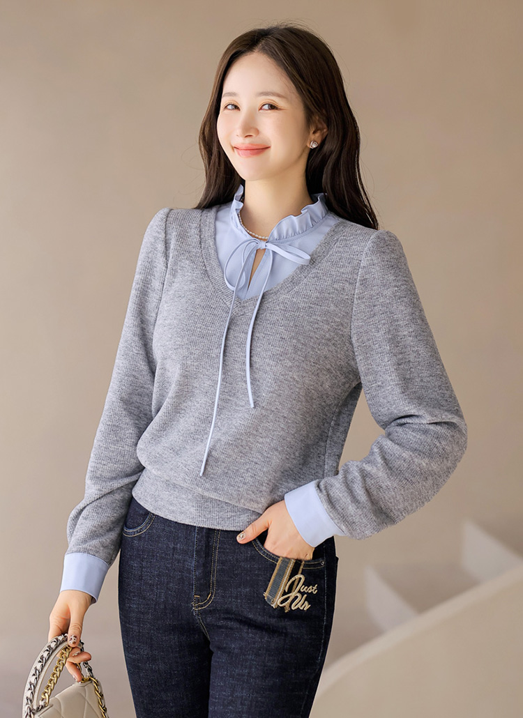 [LouisAngel] 하니하니 프릴 블라우스 배색 레이어링 포근 니트 블라우스 티
