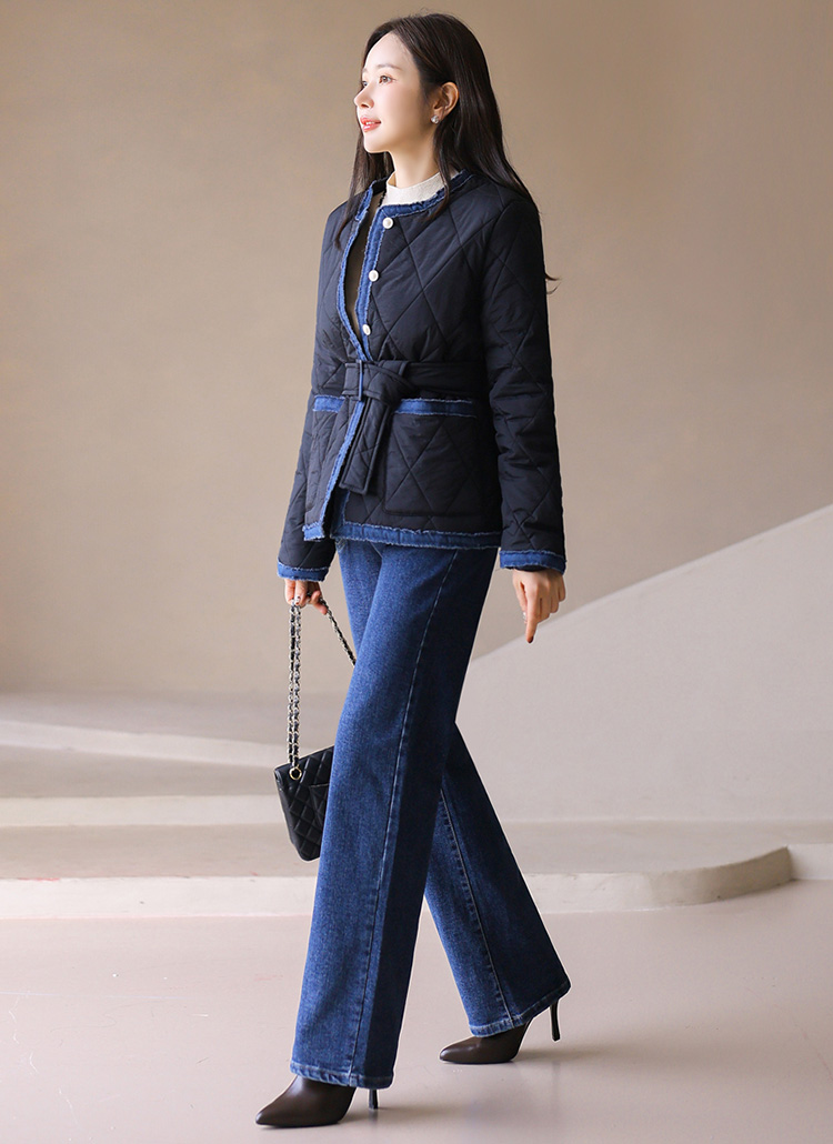 감각적인 데님 배색 디테일로 세련된 무드를 선사하는 퀄팅 패딩 점퍼에요