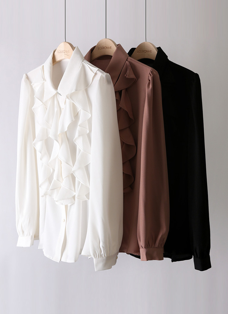 로이제 엘레강스 쥬얼 버튼 포폴드 프릴 블라우스