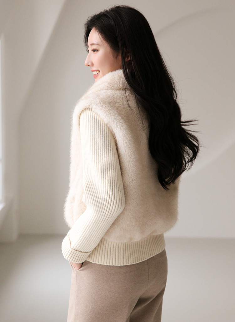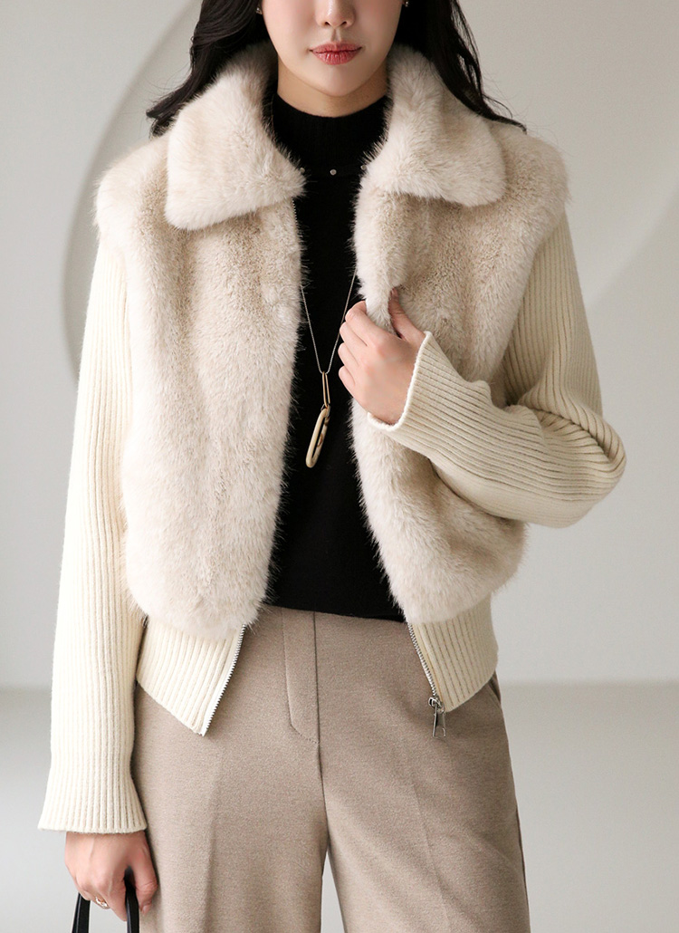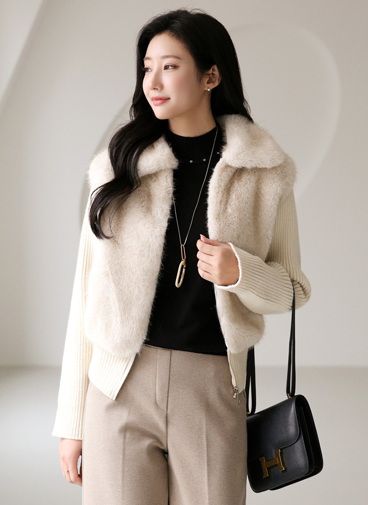 풍성한 퍼 바디와 도톰한 골지 니트 소매의 배색 조합으로