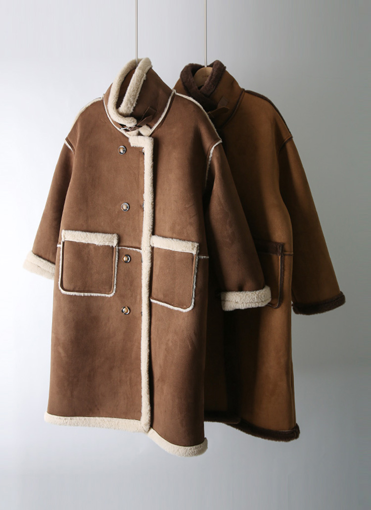 하이넥 버클 디자인의 무스탕 롱 자켓 코트예요 :)