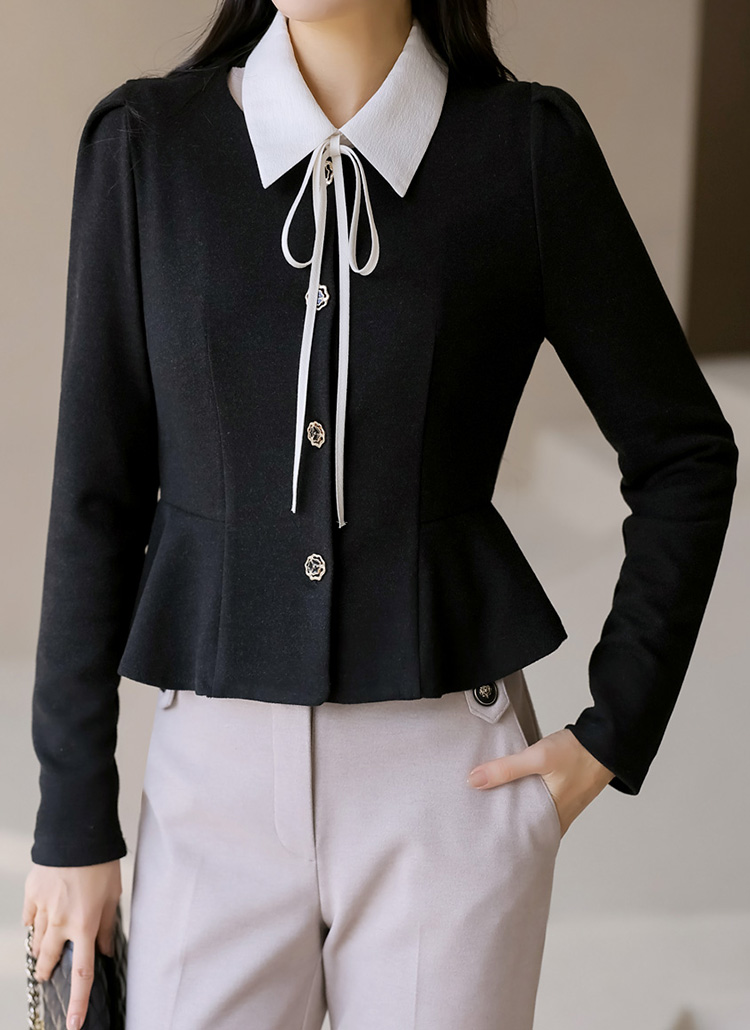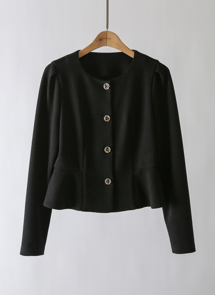 사랑스러운 페플럼 실루엣과 로즈 패턴의 골드버튼 디자인의 조화로