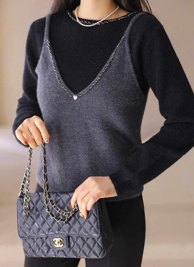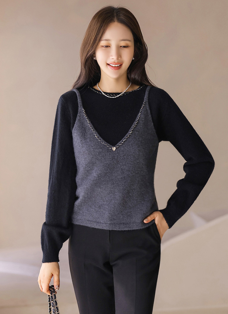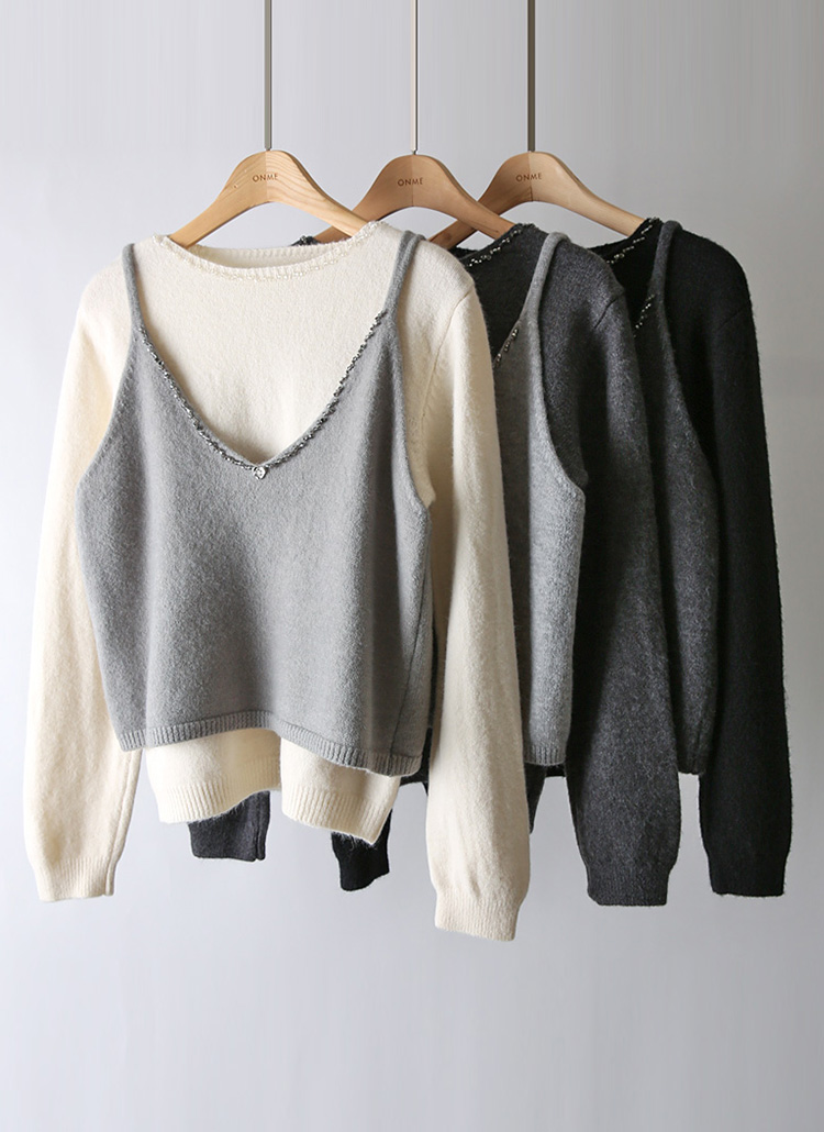 하트 펜던트 비즈 라인 포인트 니트 조끼 입술넥 니트 투피스 세트