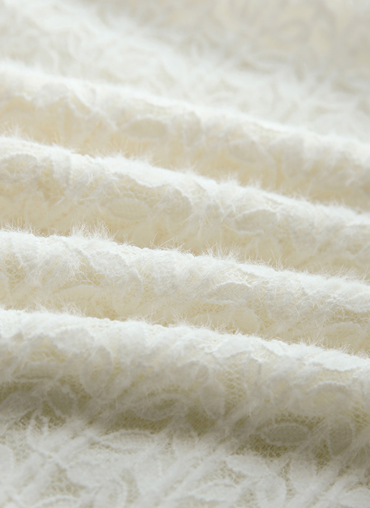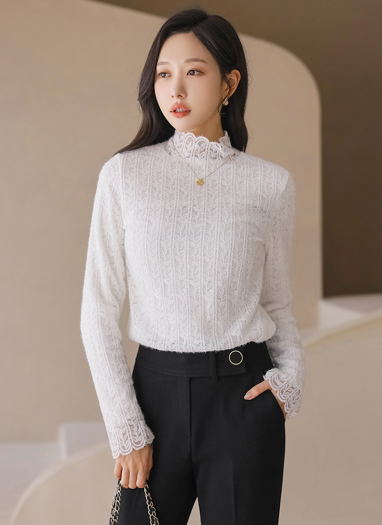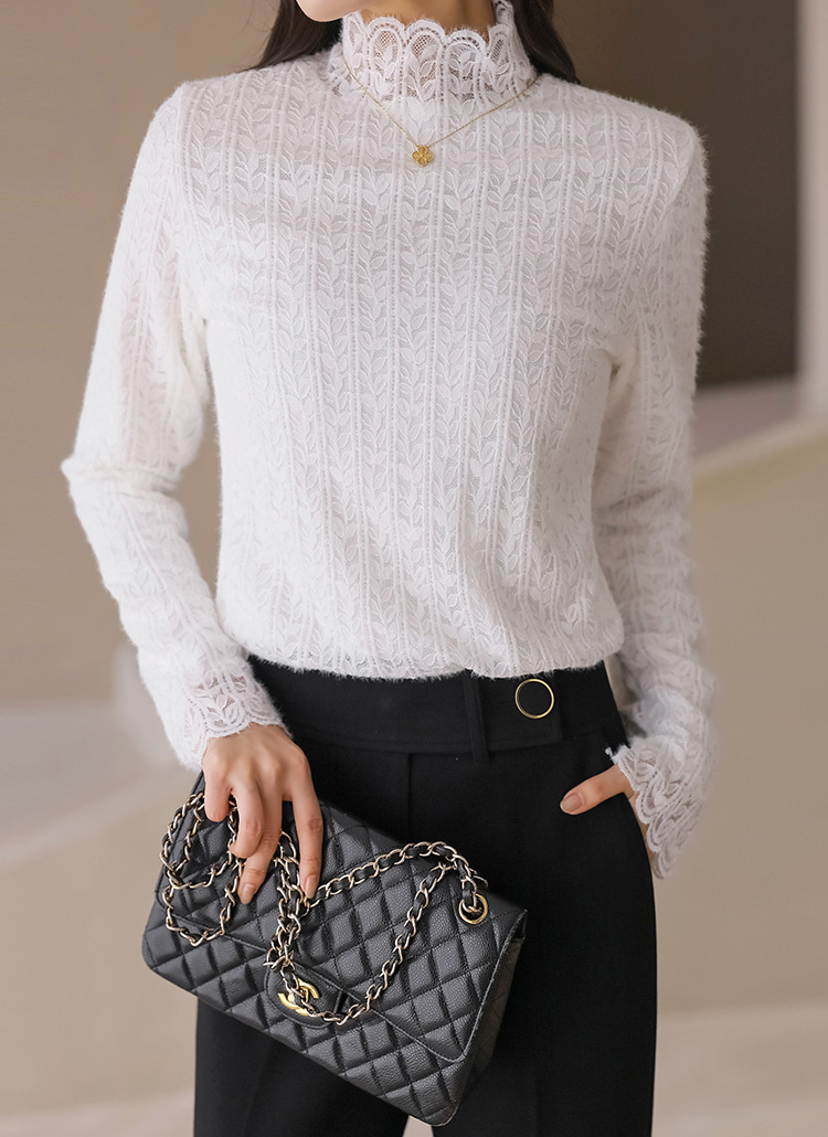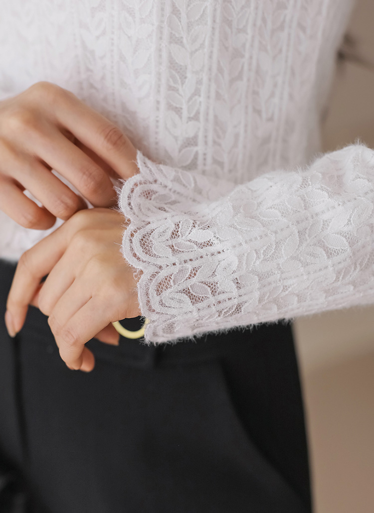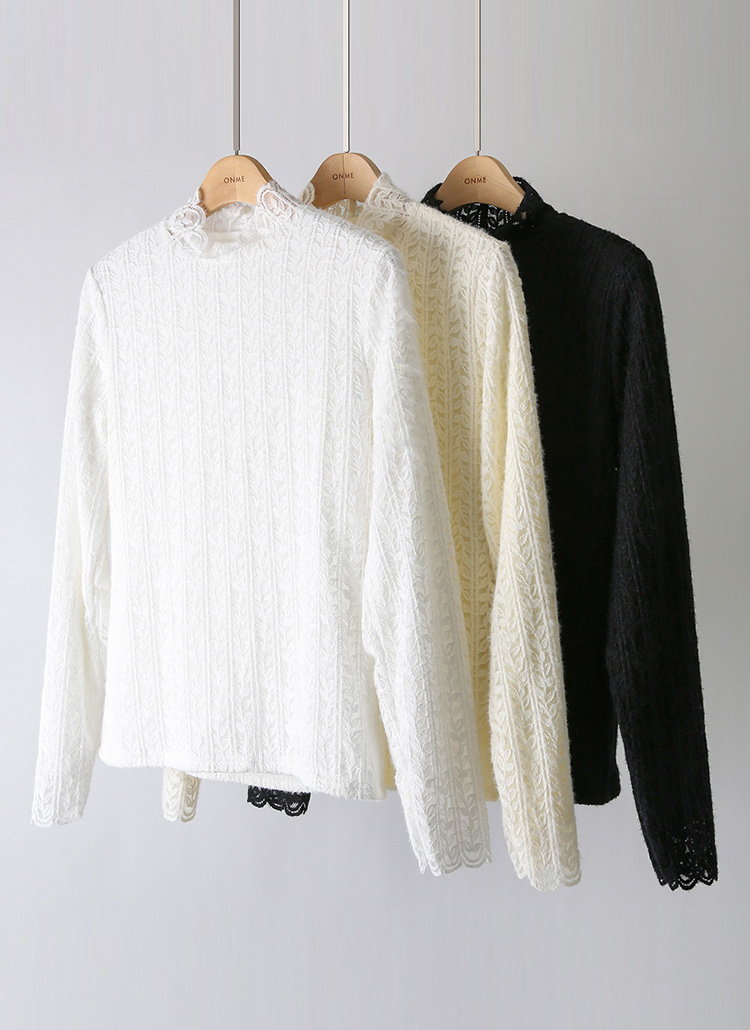 오벨리 에스닉 리프 날개사 레이스 기모 안감 반 하이넥 블라우스 티