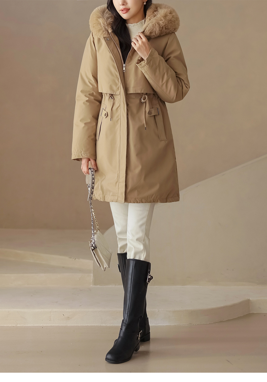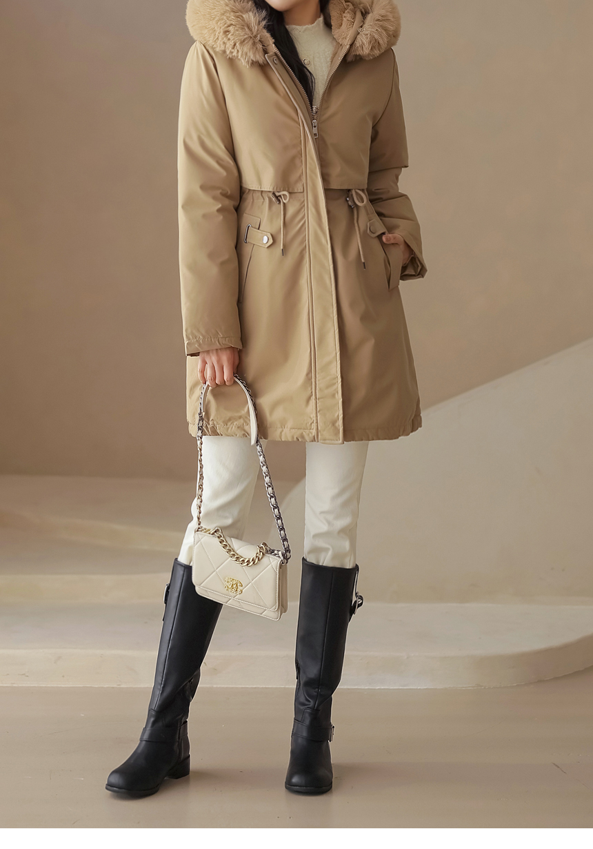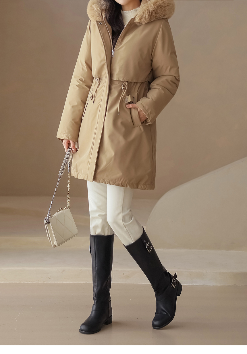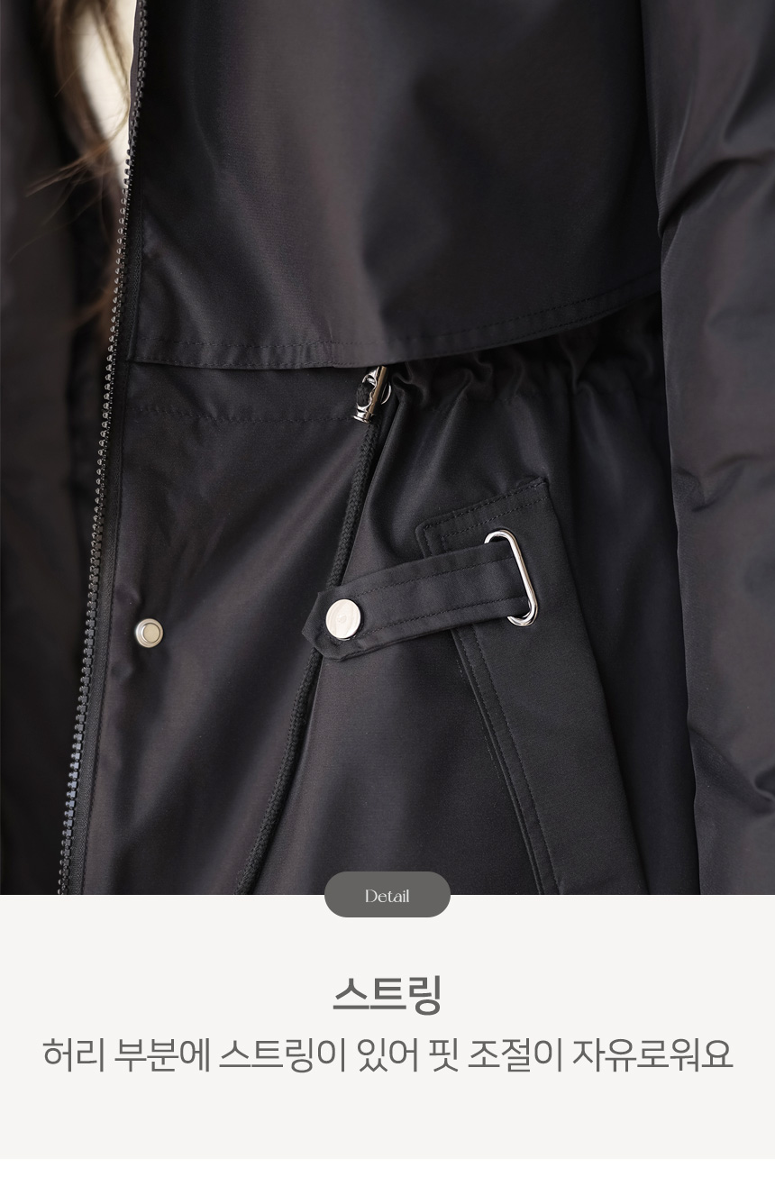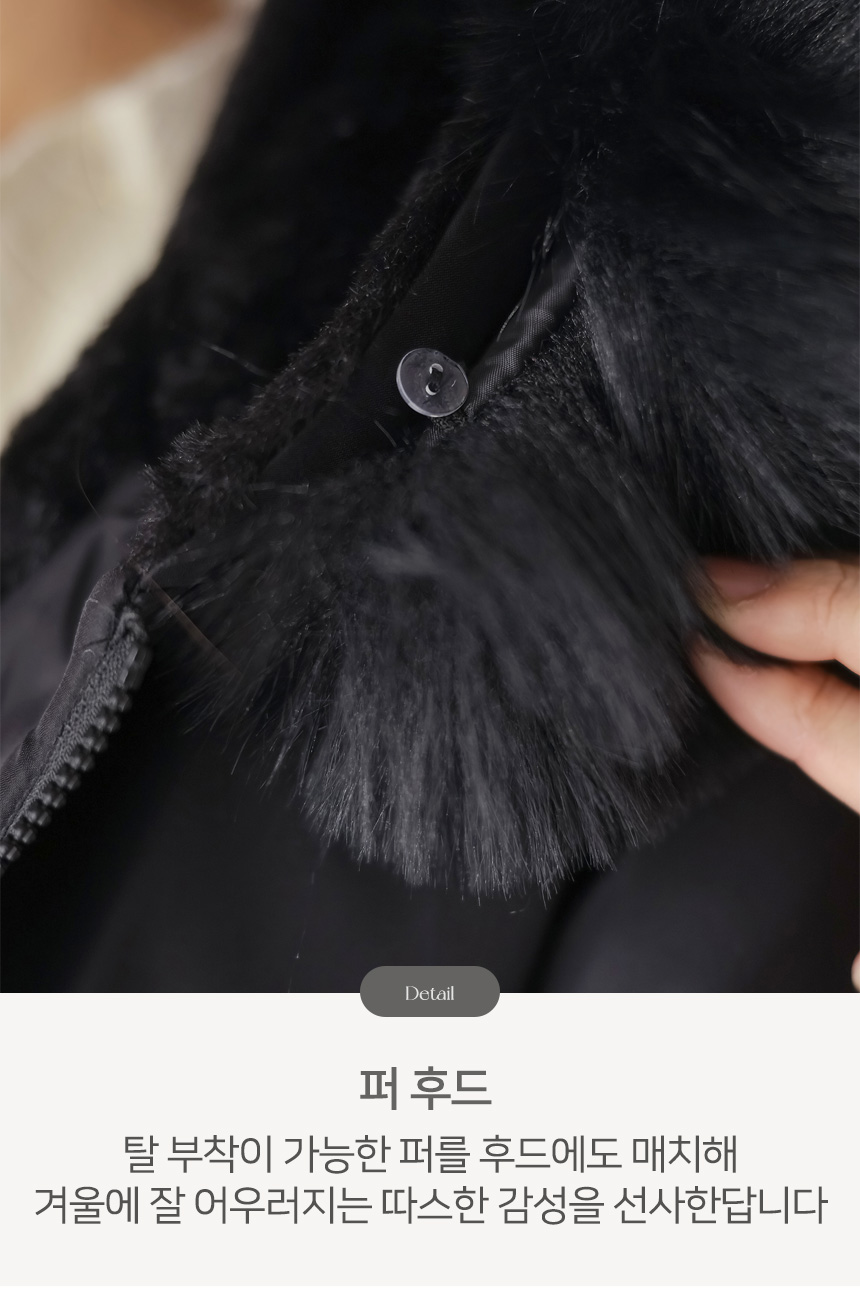 베비도 포근 퍼 안감 허리 스트링 미드 하프 후드 패딩 점퍼