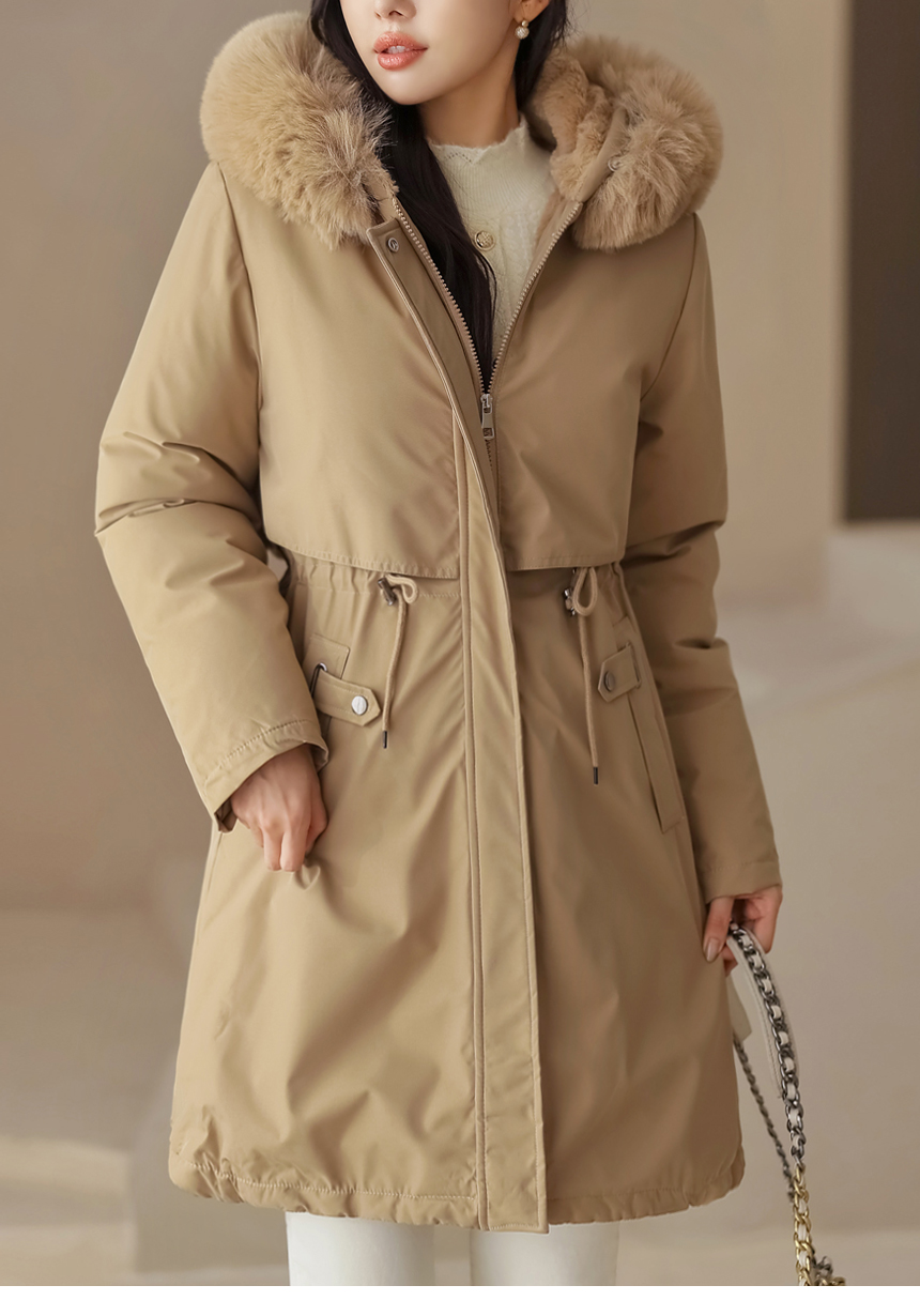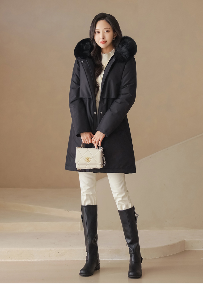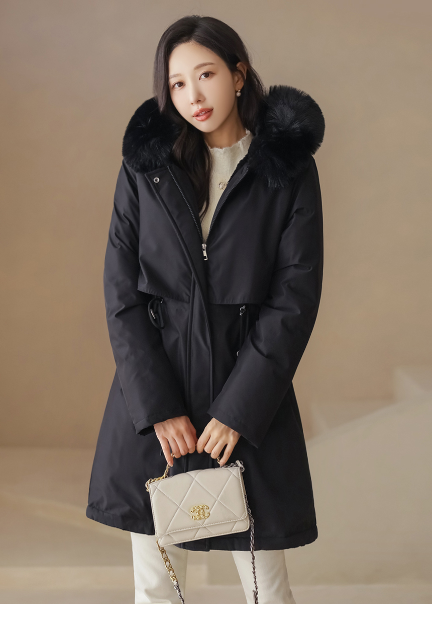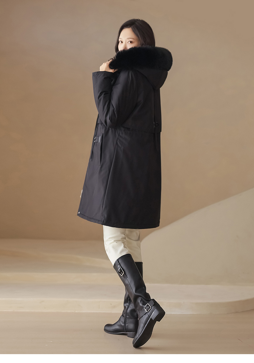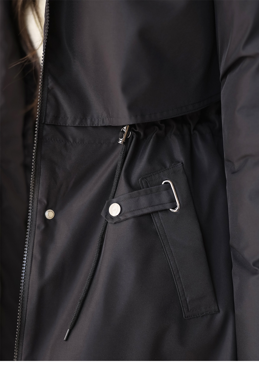 베비도 포근 퍼 안감 허리 스트링 미드 하프 후드 패딩 점퍼