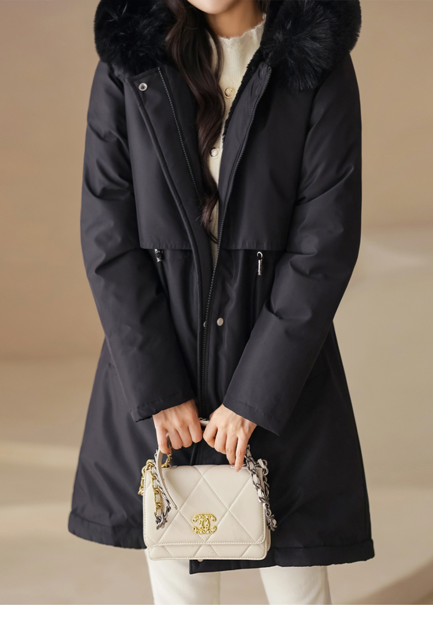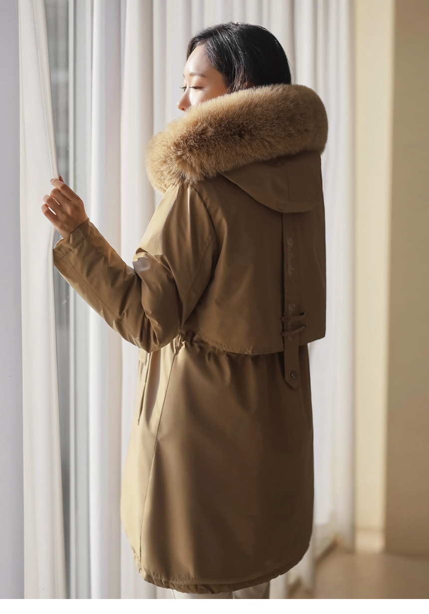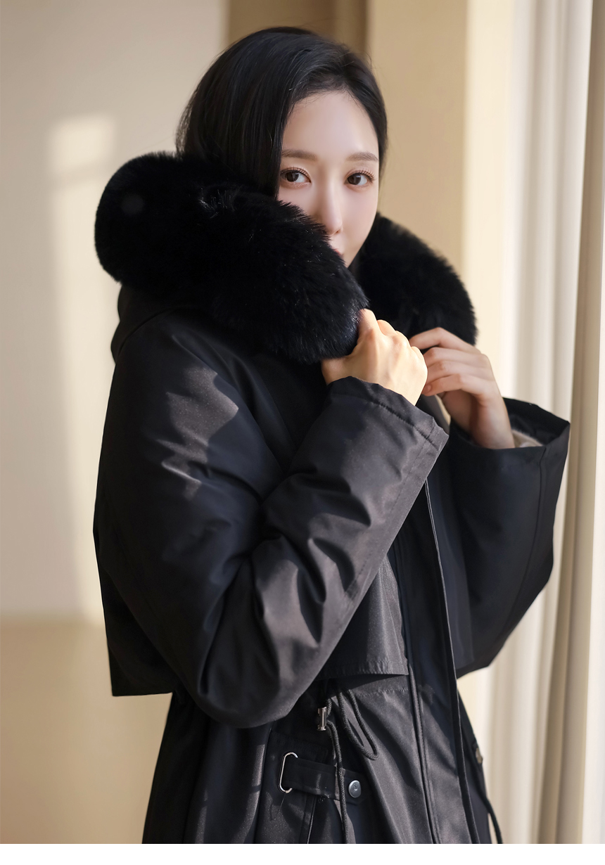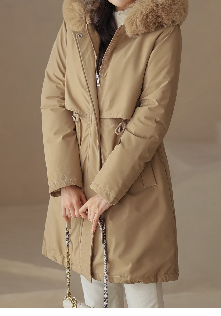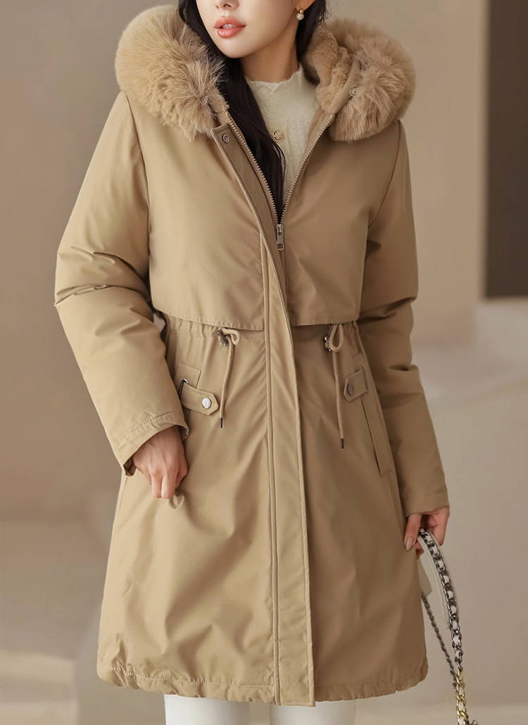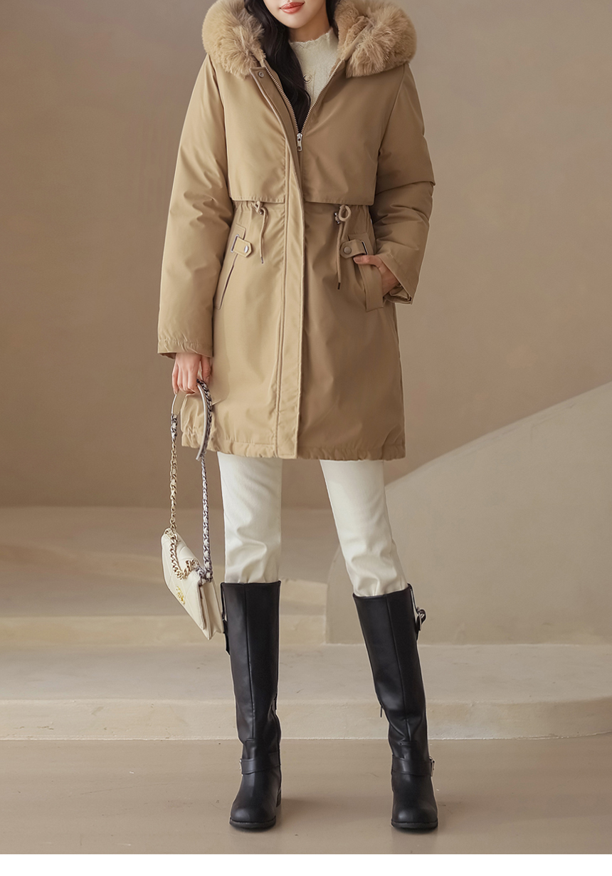 베비도 포근 퍼 안감 허리 스트링 미드 하프 후드 패딩 점퍼