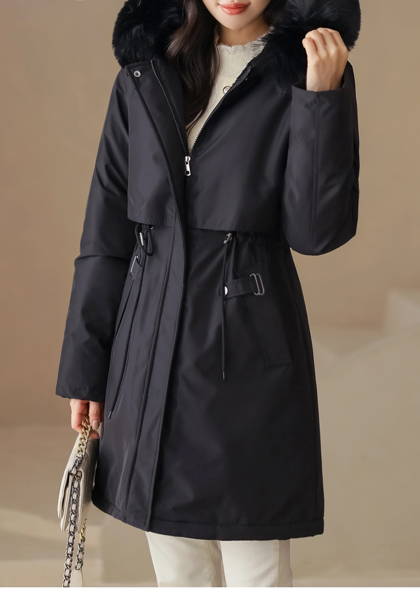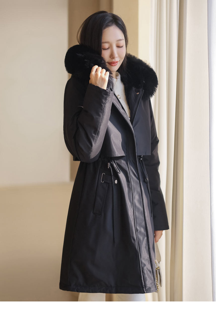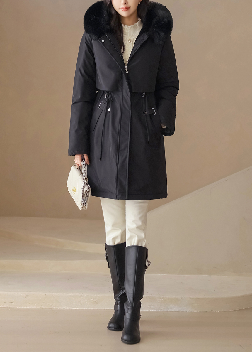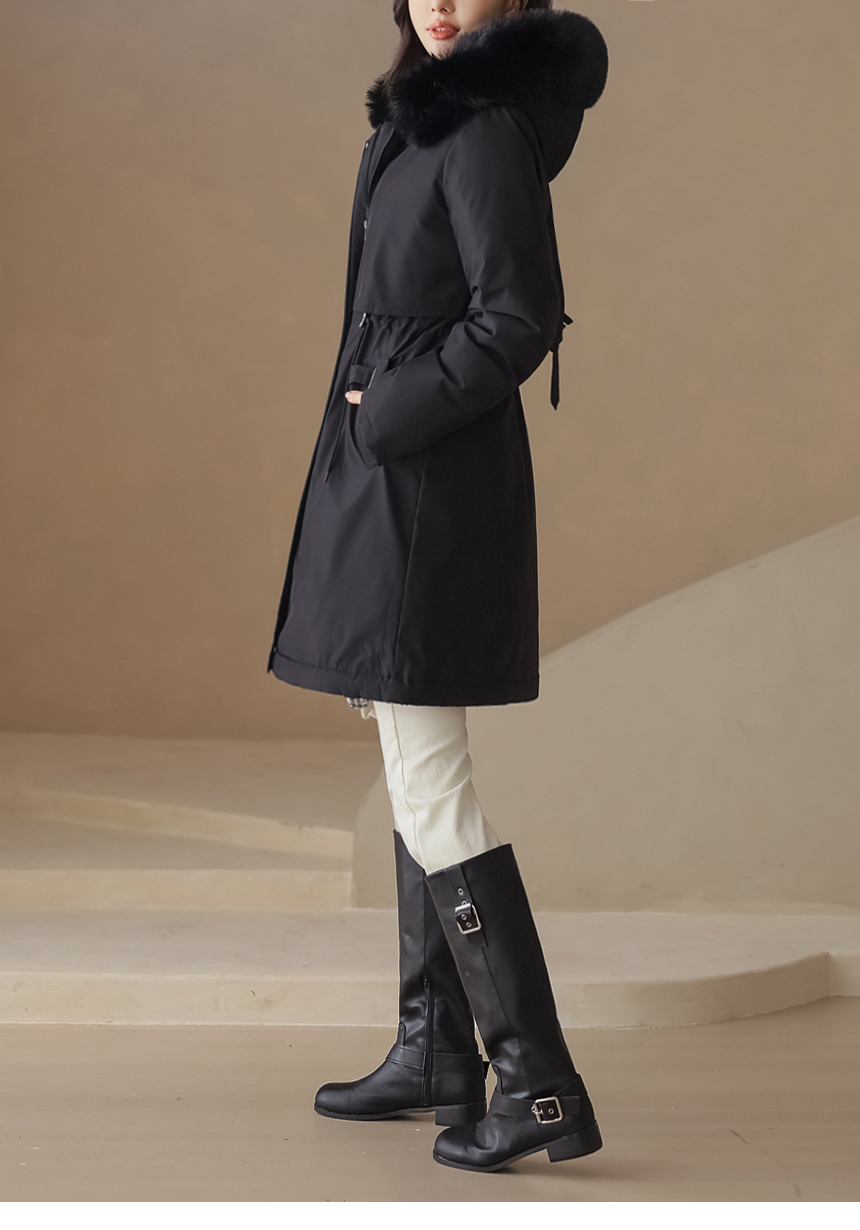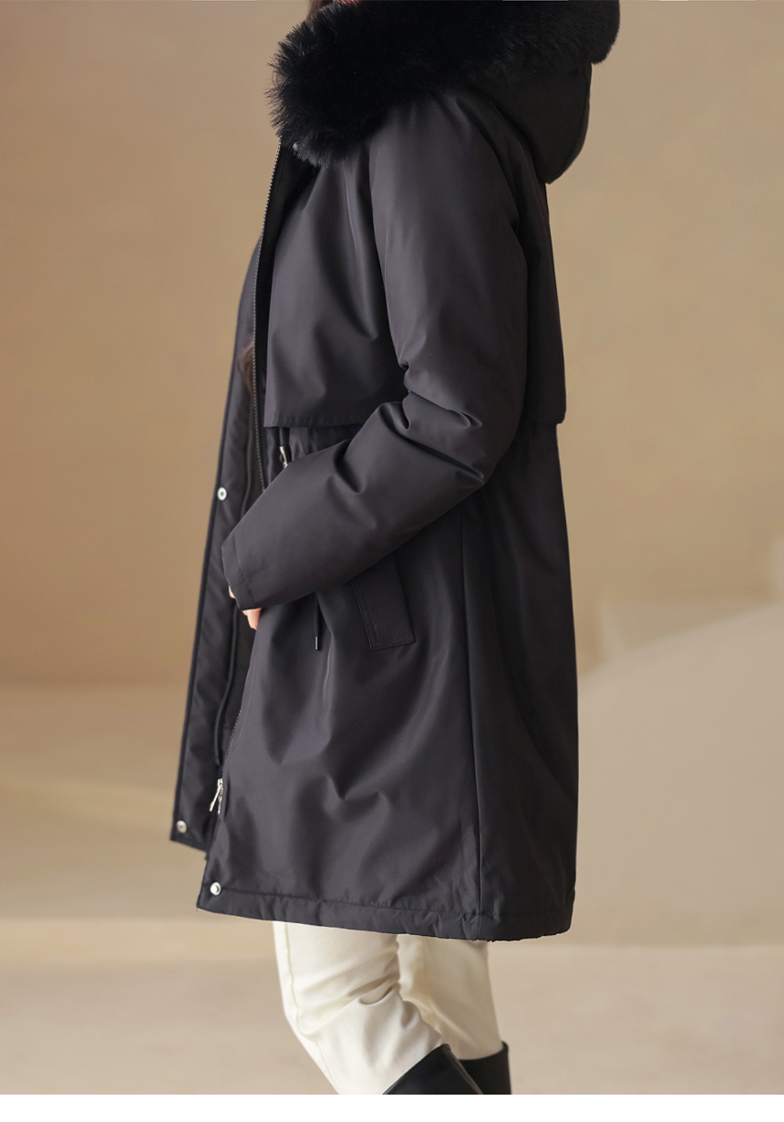 베비도 포근 퍼 안감 허리 스트링 미드 하프 후드 패딩 점퍼