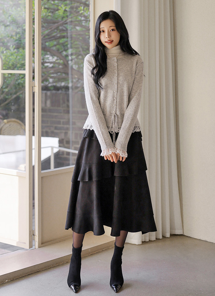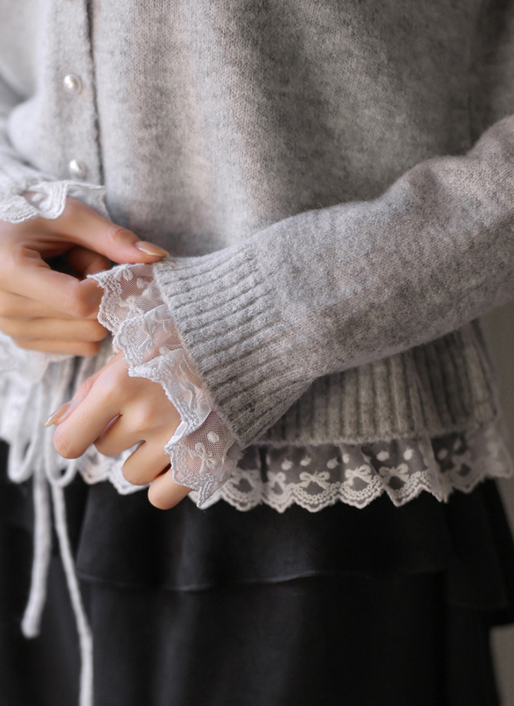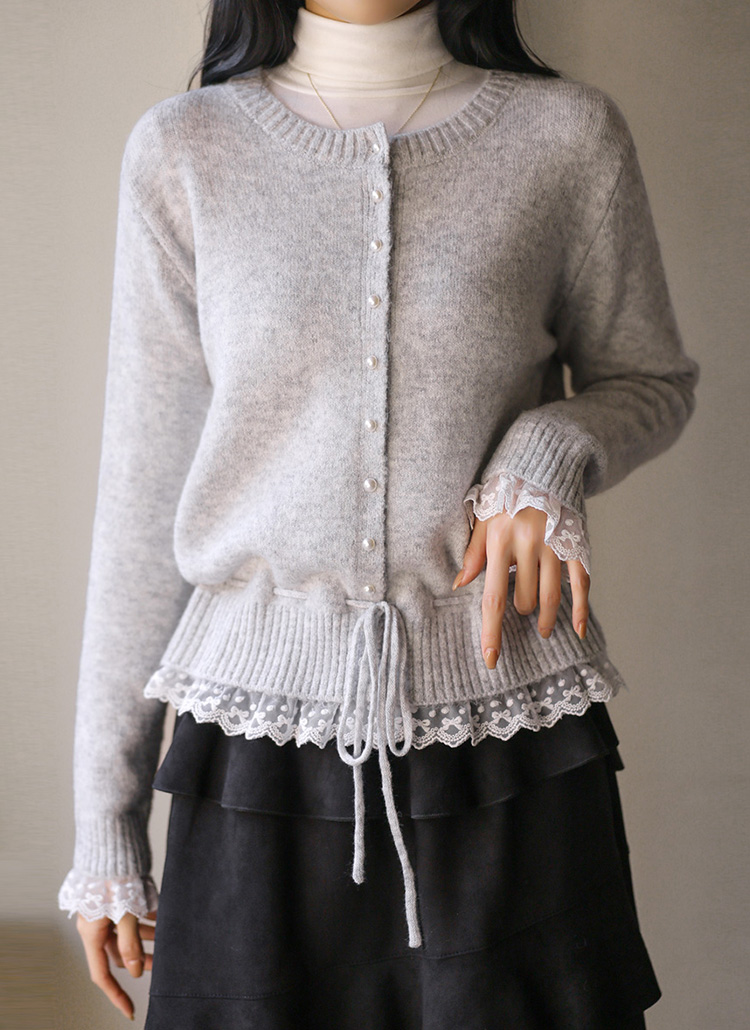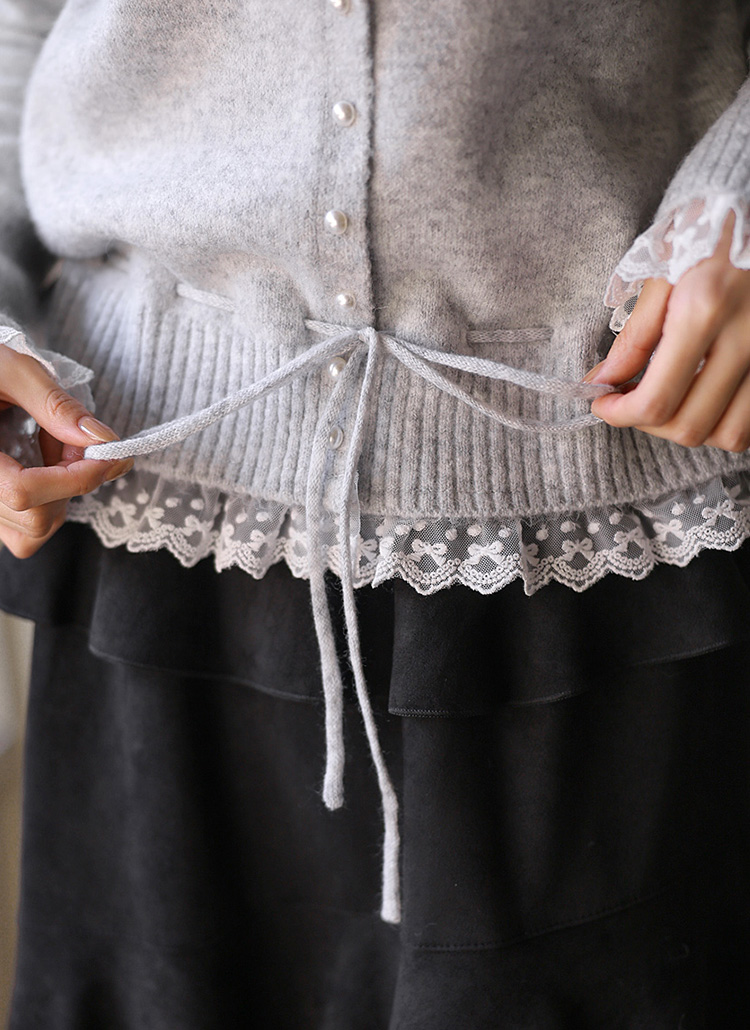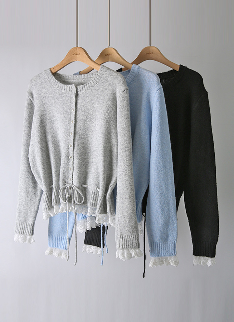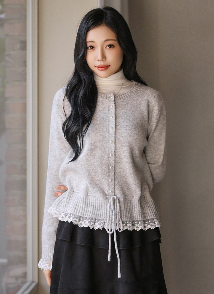 프리아 레이스 레이어드 페미닌 스트링 진주 니트 가디건