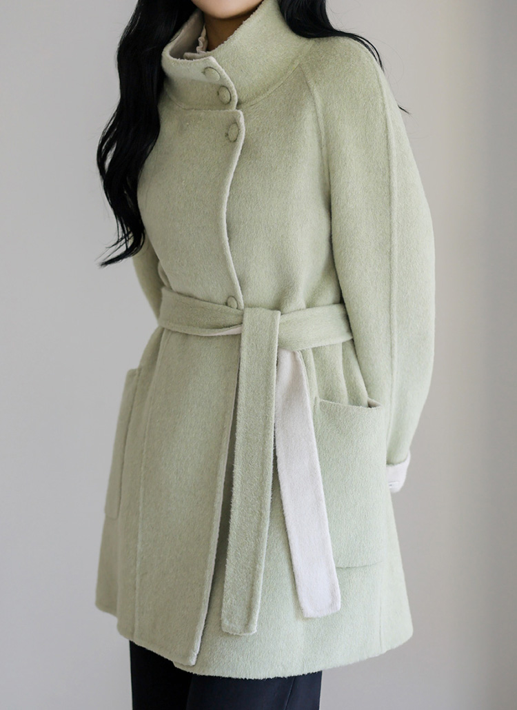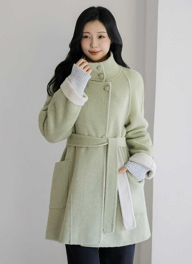 [Theonme] 소프트무드 울70 배색 하이넥 핸드메이드 하프 코트
