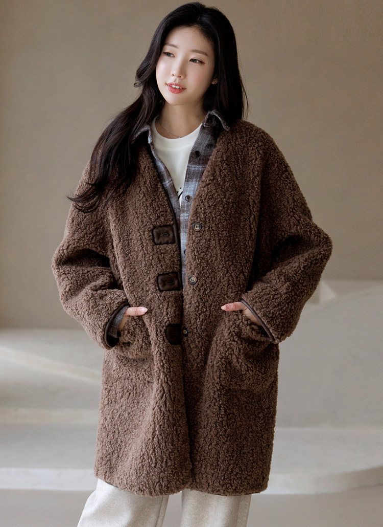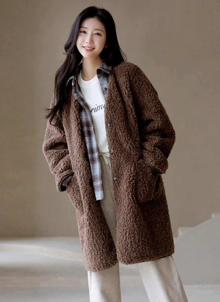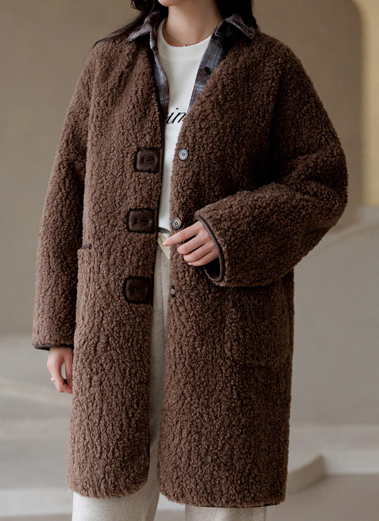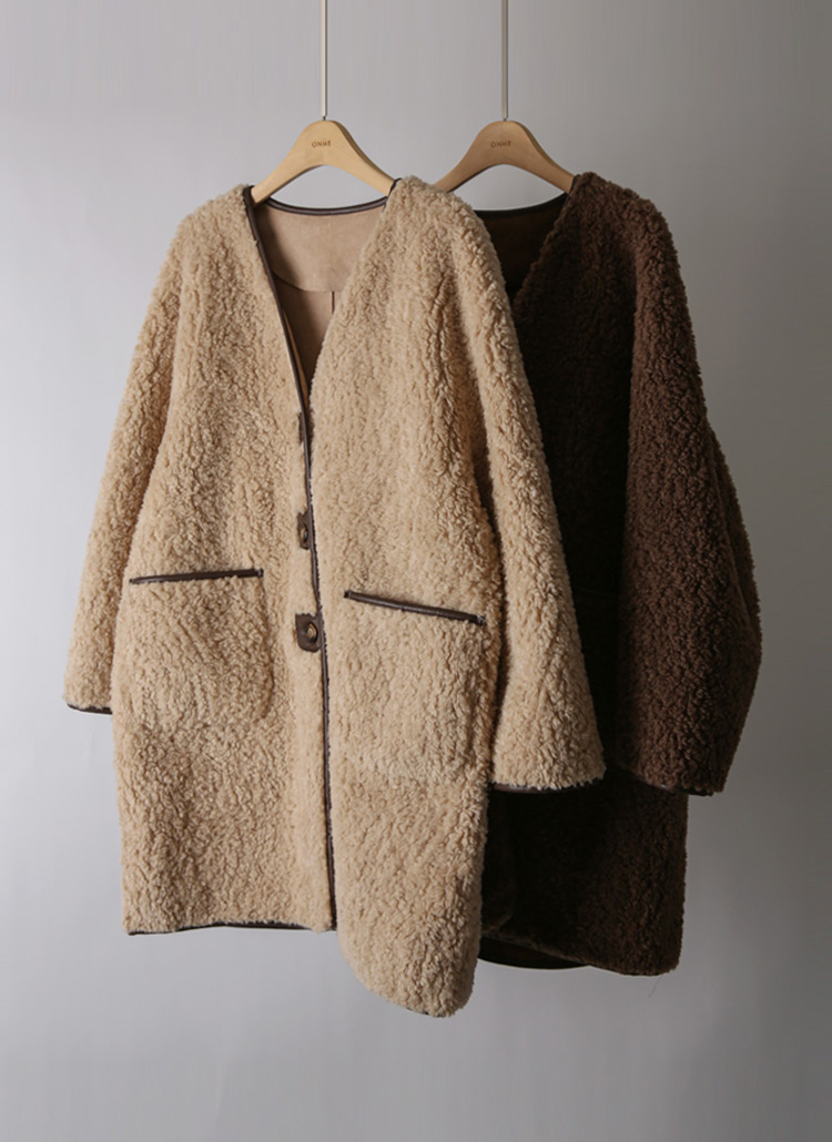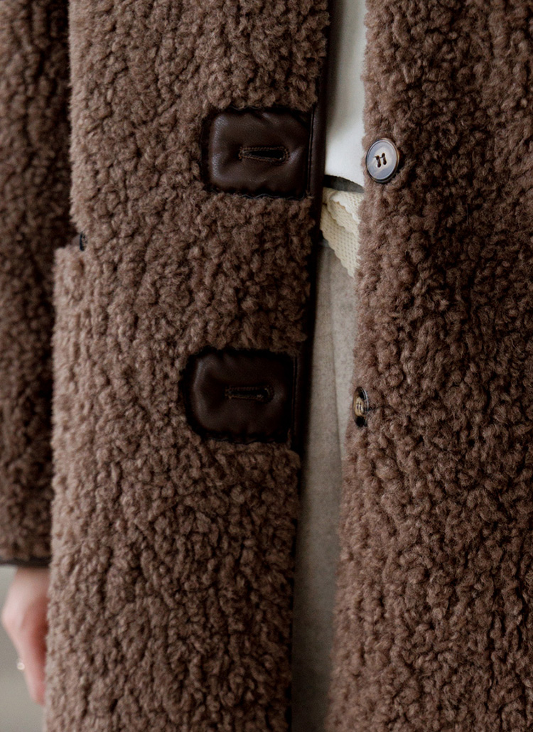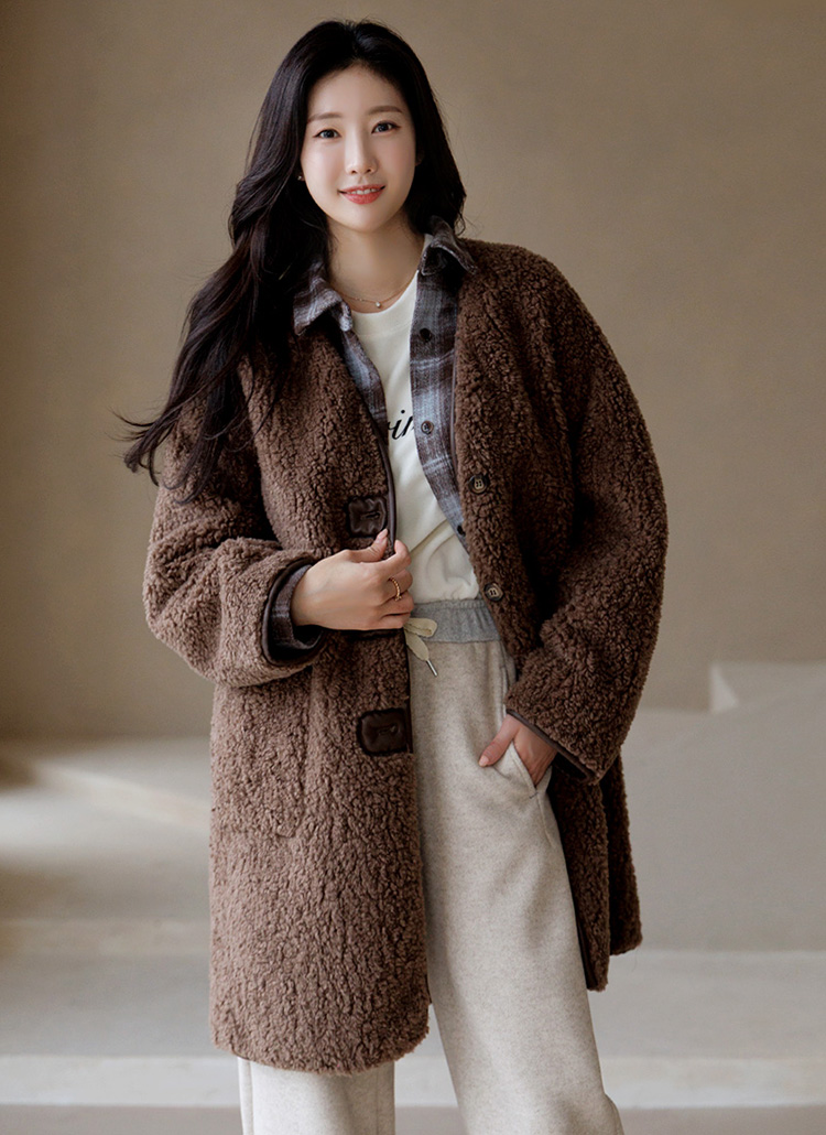 체이크 레더배색 도톰 부클 뽀글 퍼 오버핏 롱 코트
