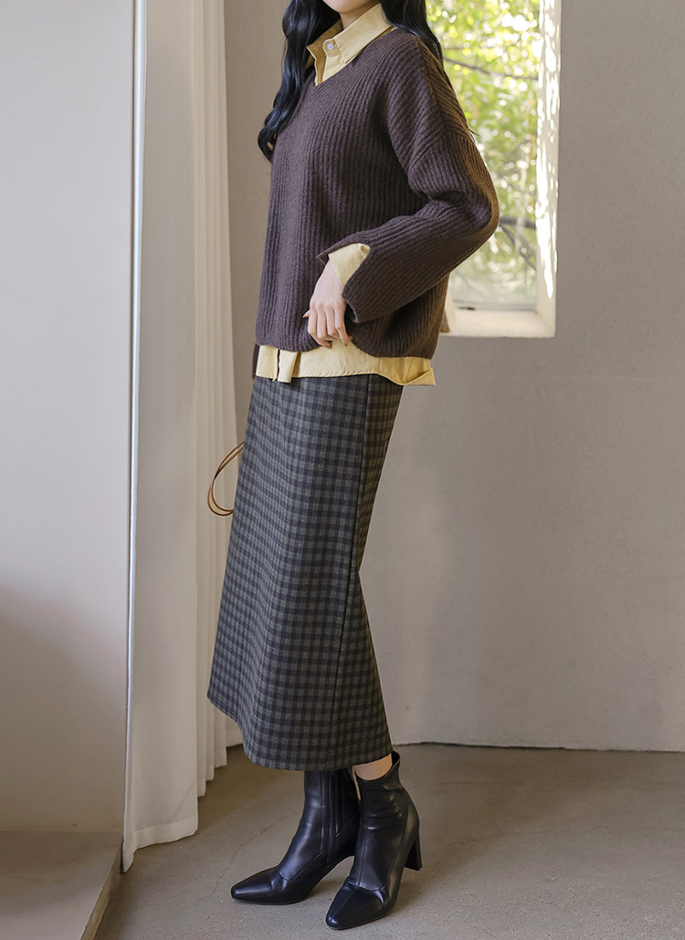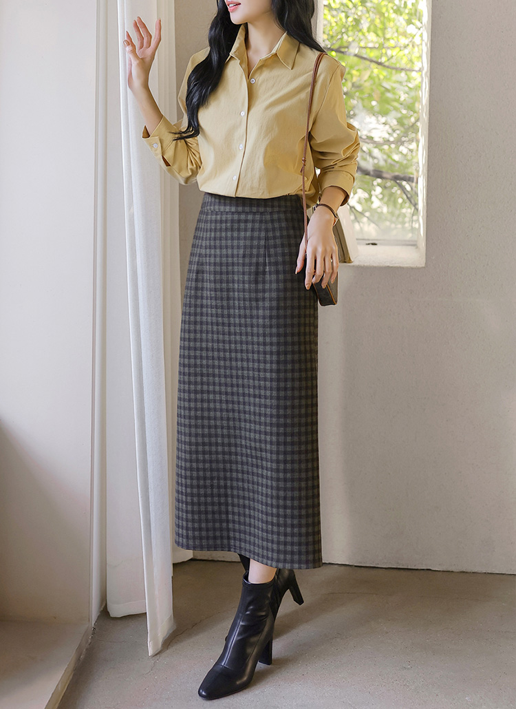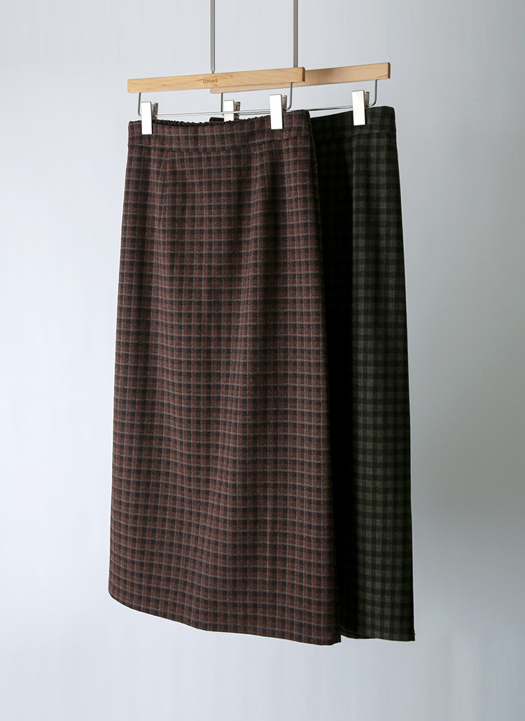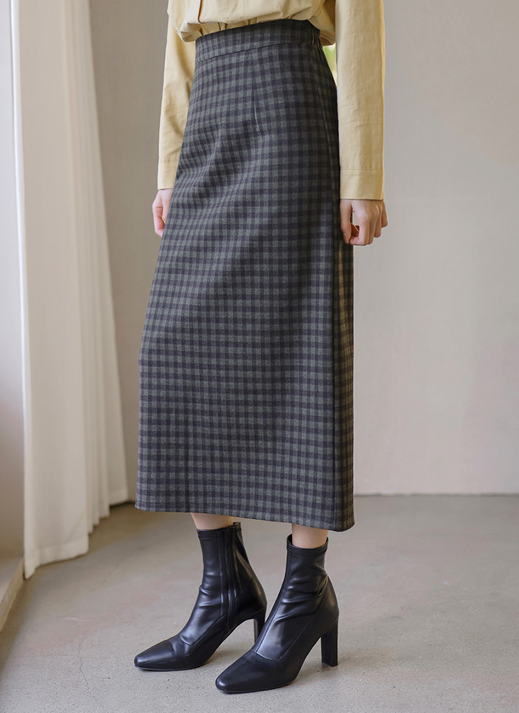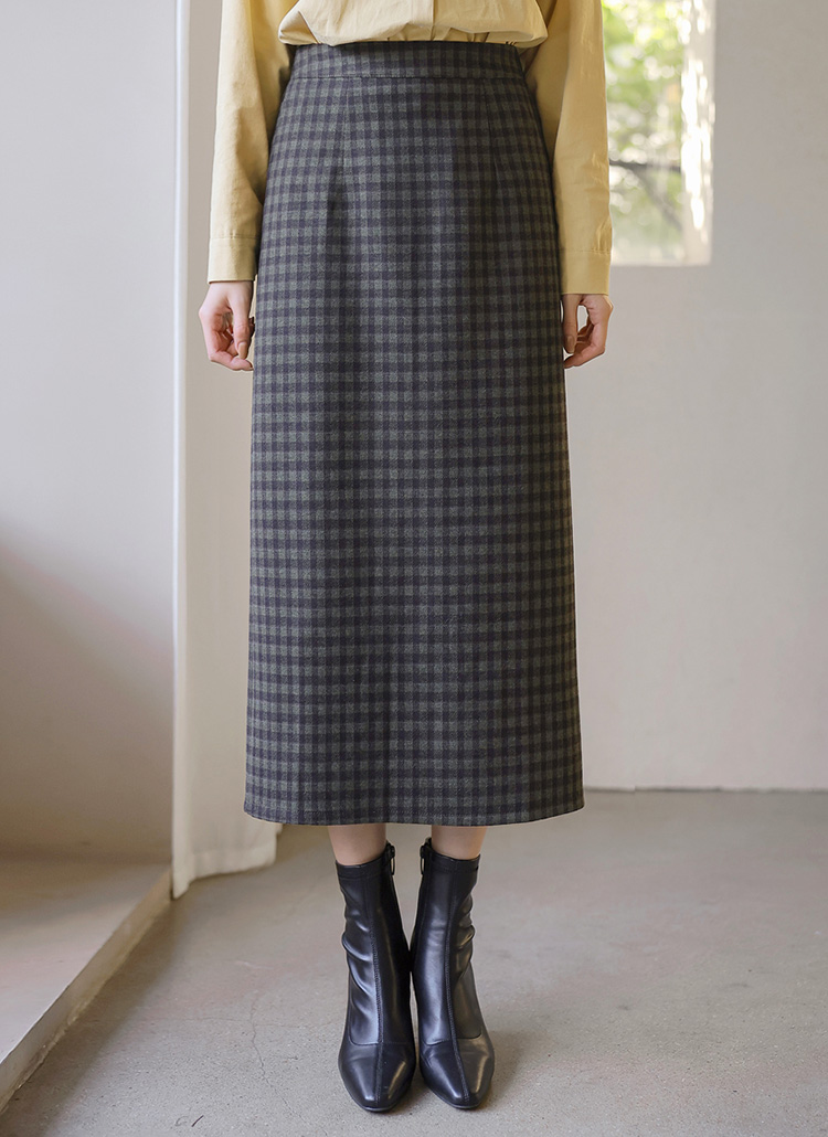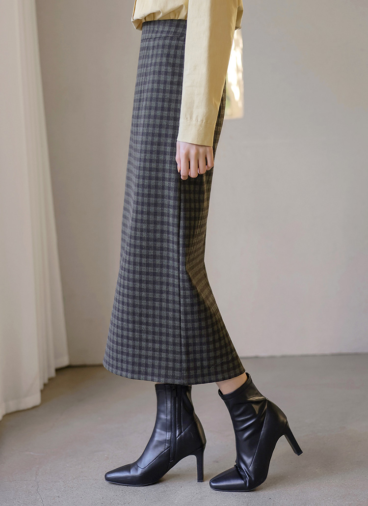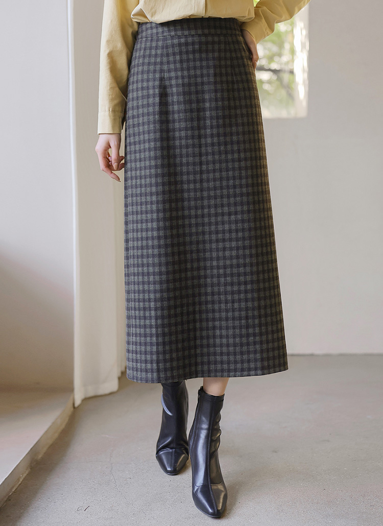 [Theonme] 젬므 배색 체크 뒷트임 H라인 롱 스커트