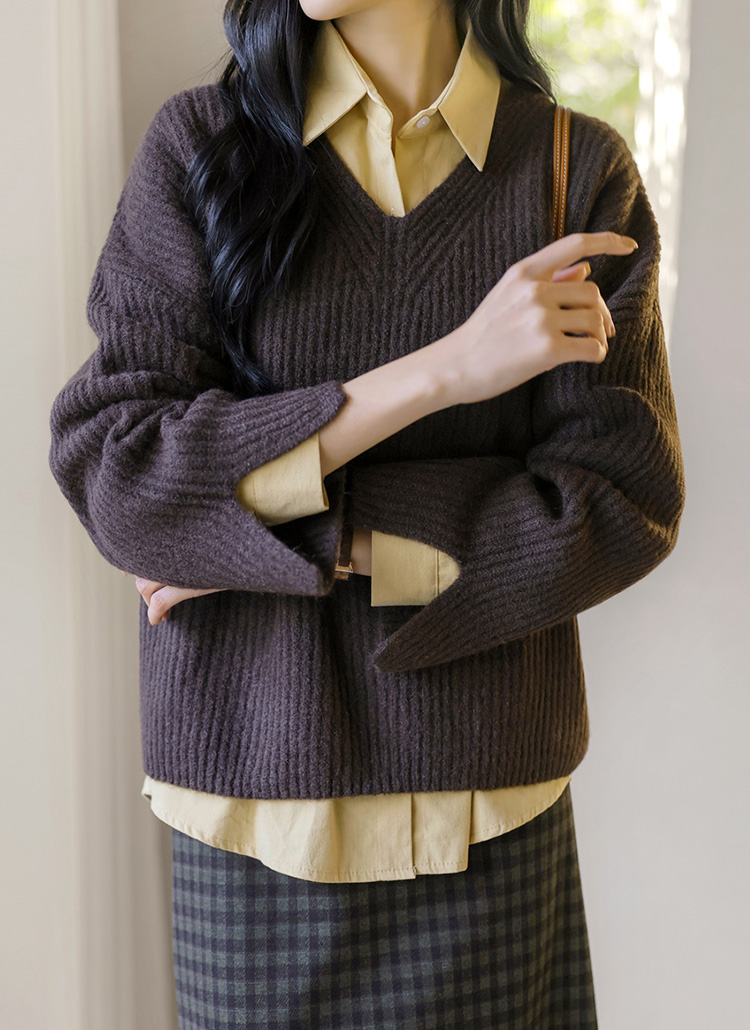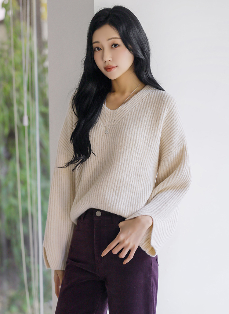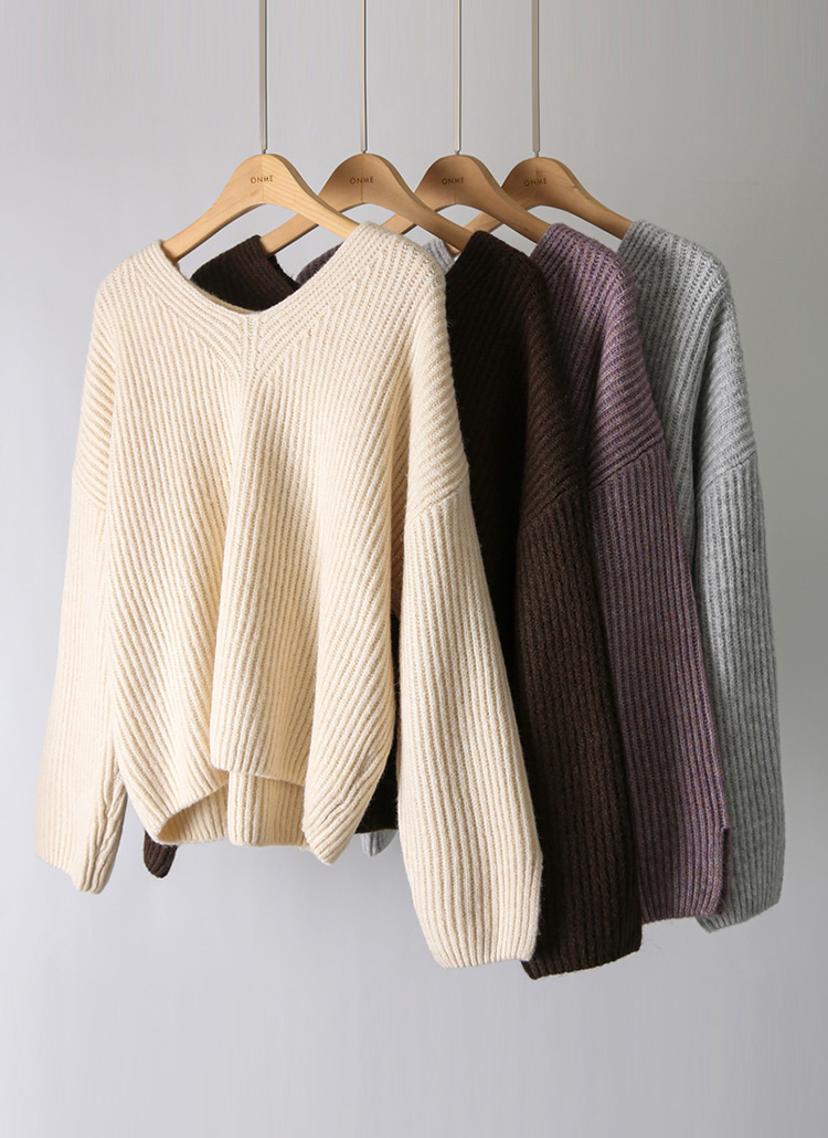 [Theonme] 다엘린 도톰 울 골지 소매트임 루즈핏 브이넥 니트