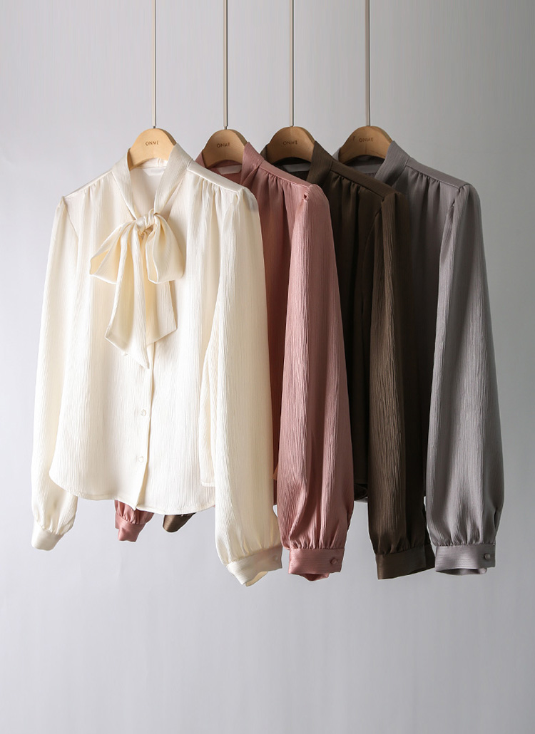 플리크 타이 리본 브이넥 새틴 링클 블라우스