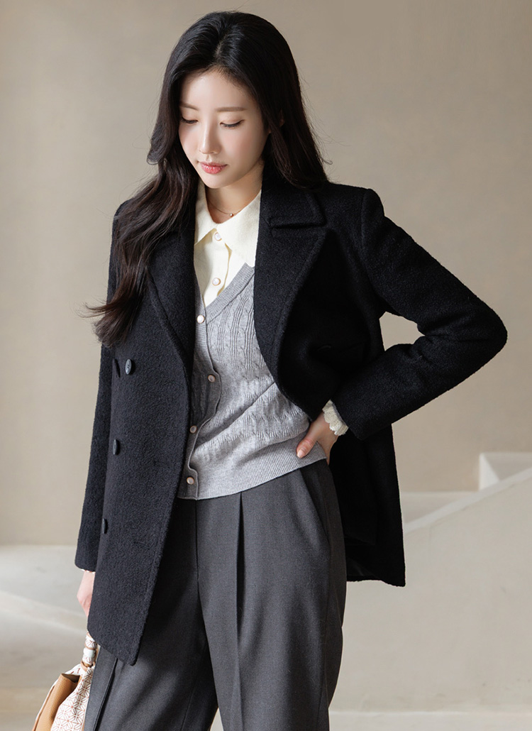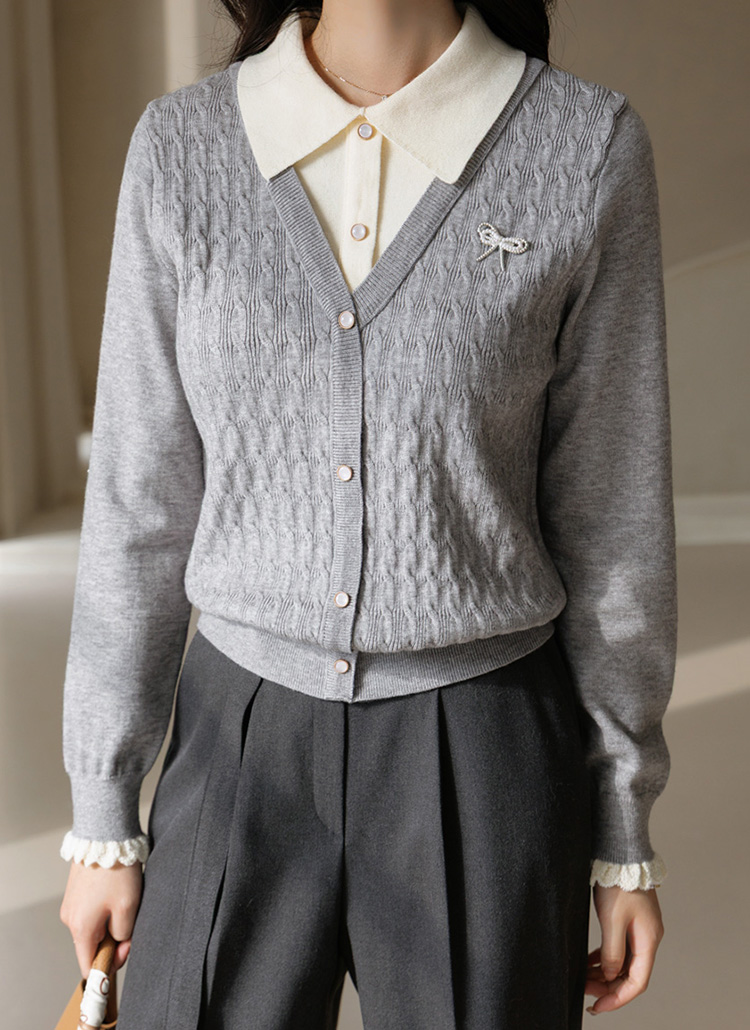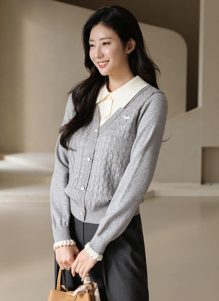 카라 니트와 가디건을 한 벌로 매치한 듯한