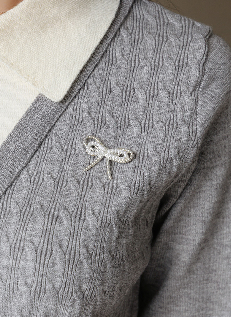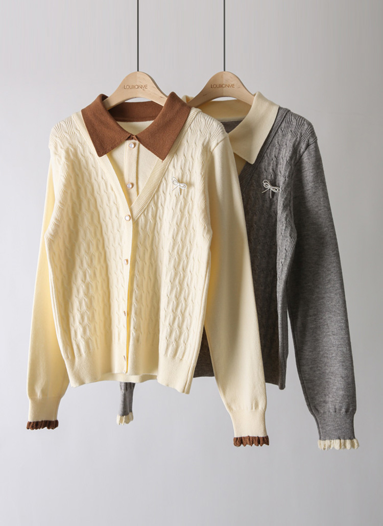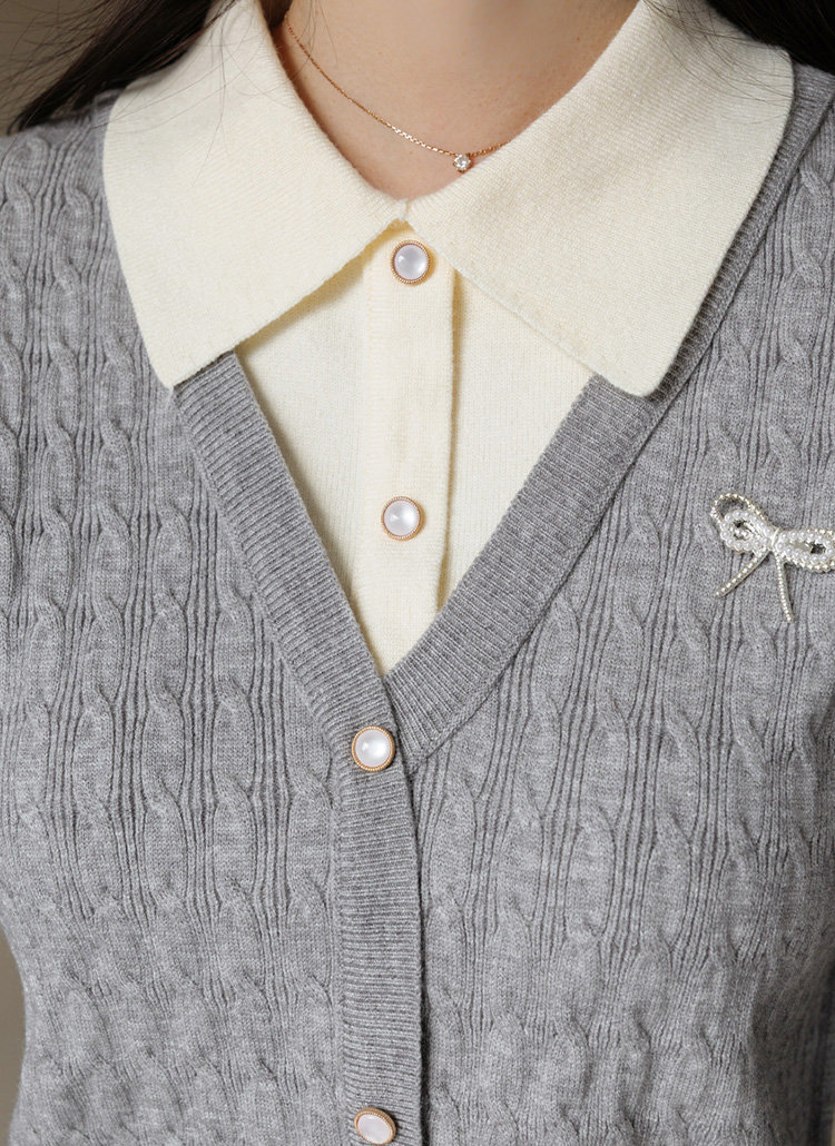 메랄다 리본브로치 SET 꽈배기 배색 레이어드 디자인 카라 니트