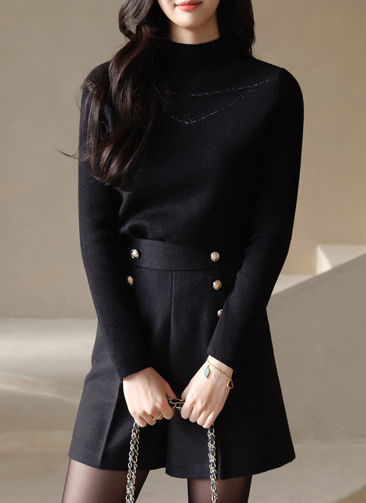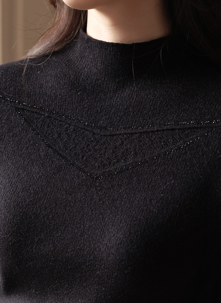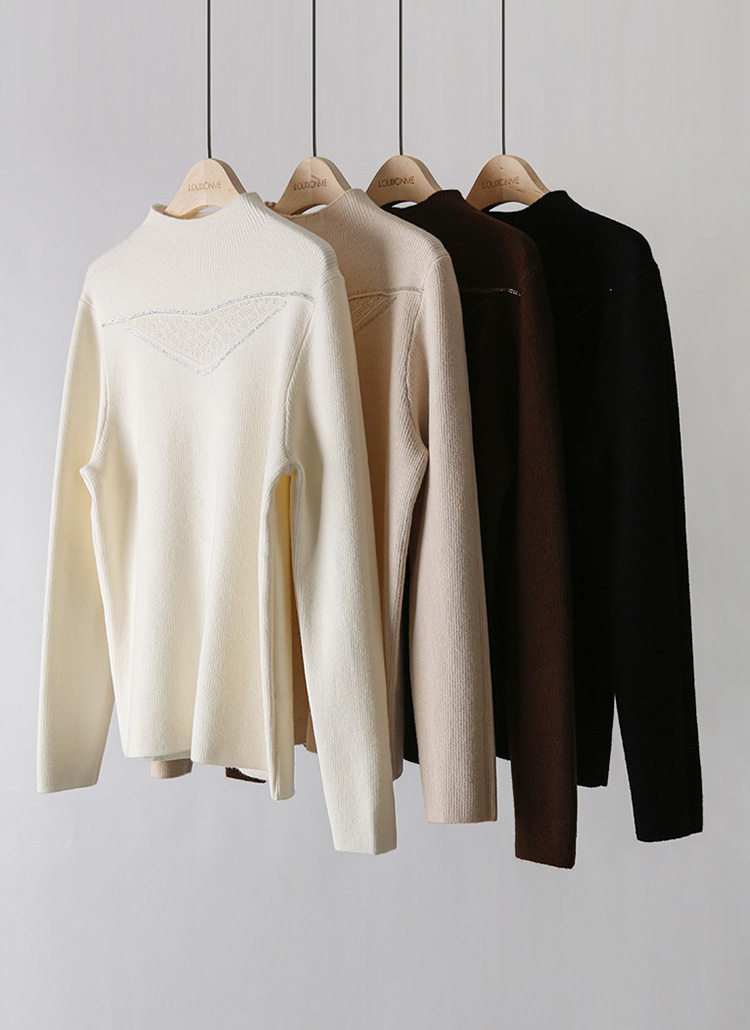 오벨라 삼각 레이스 배색 비즈 포인트 속 기모 반 하이넥 니트