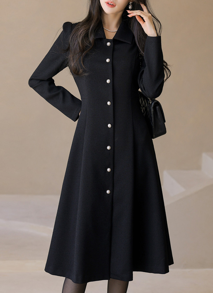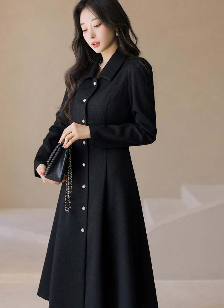 엘르샤 클래시 진주 버튼 A라인 플레어 롱 트위드 원피스