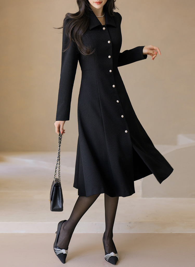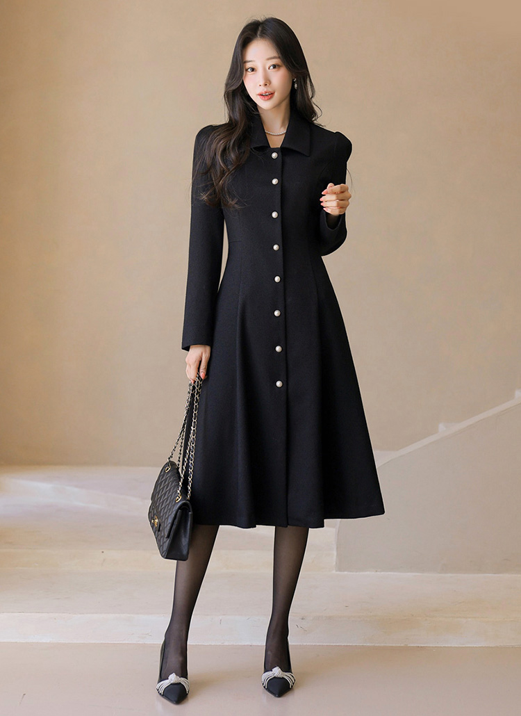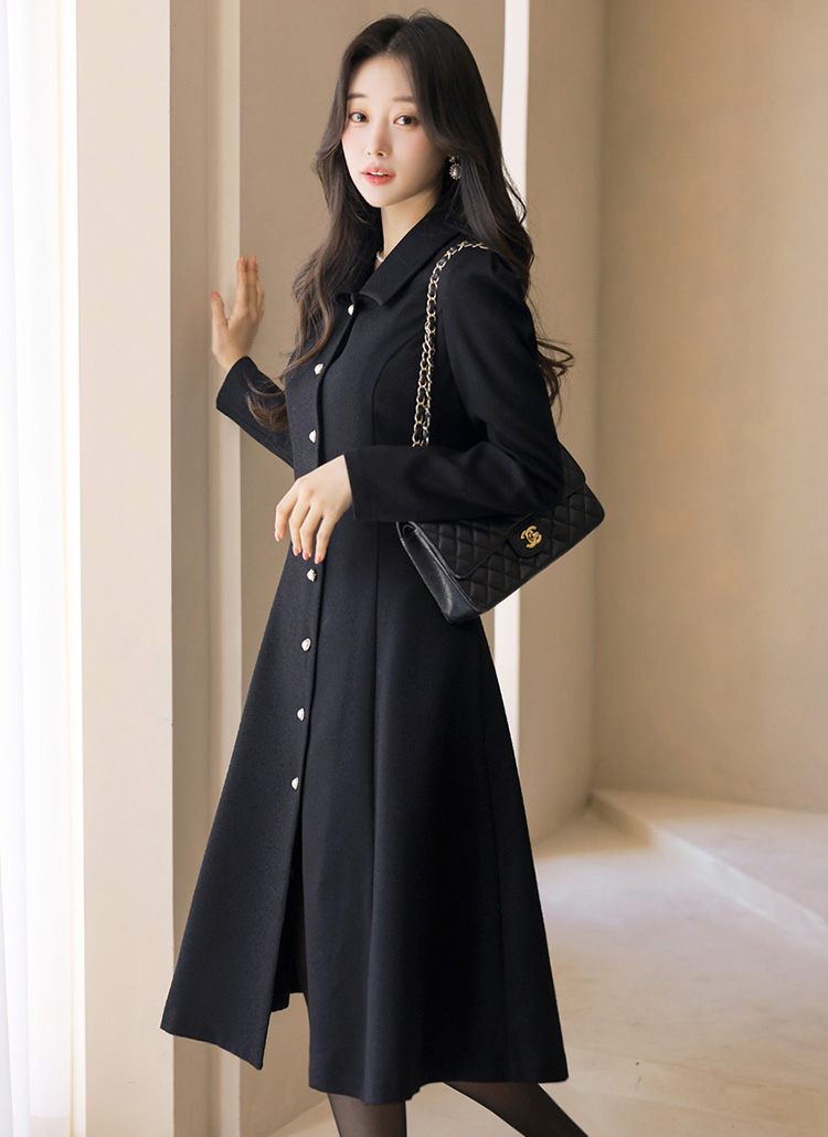클래식한 블랙 컬러 위에 더해진 진주 버튼 디테일은
