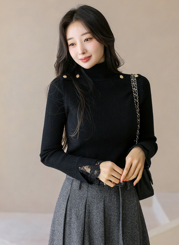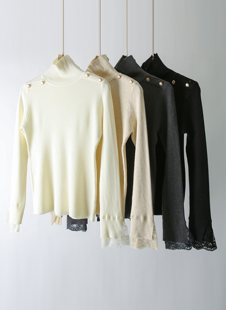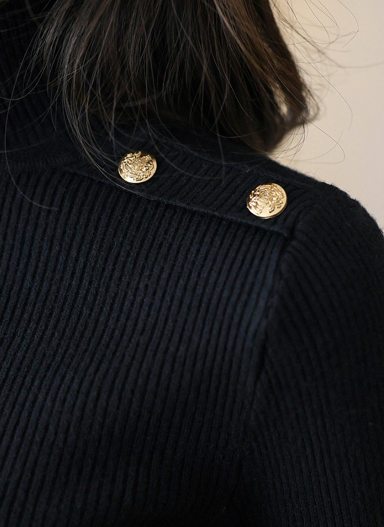 셀로테 소매 트임 레이스 배색 어깨 견장 골드 버튼 폴라 니트