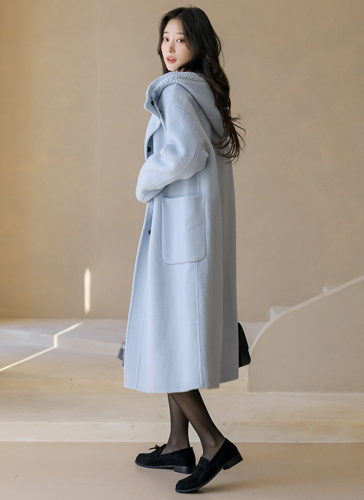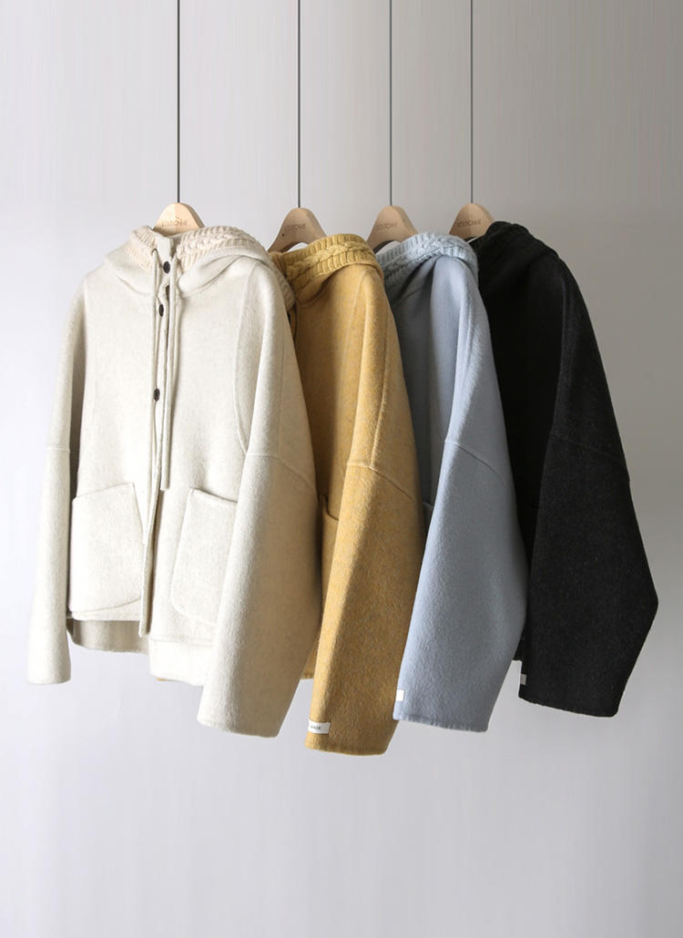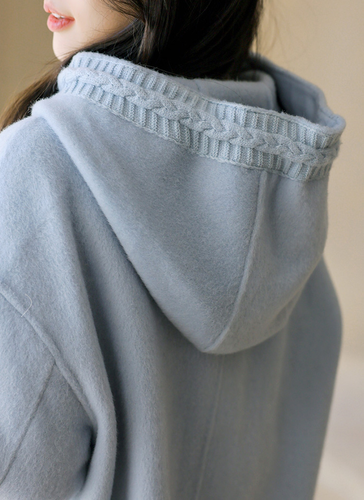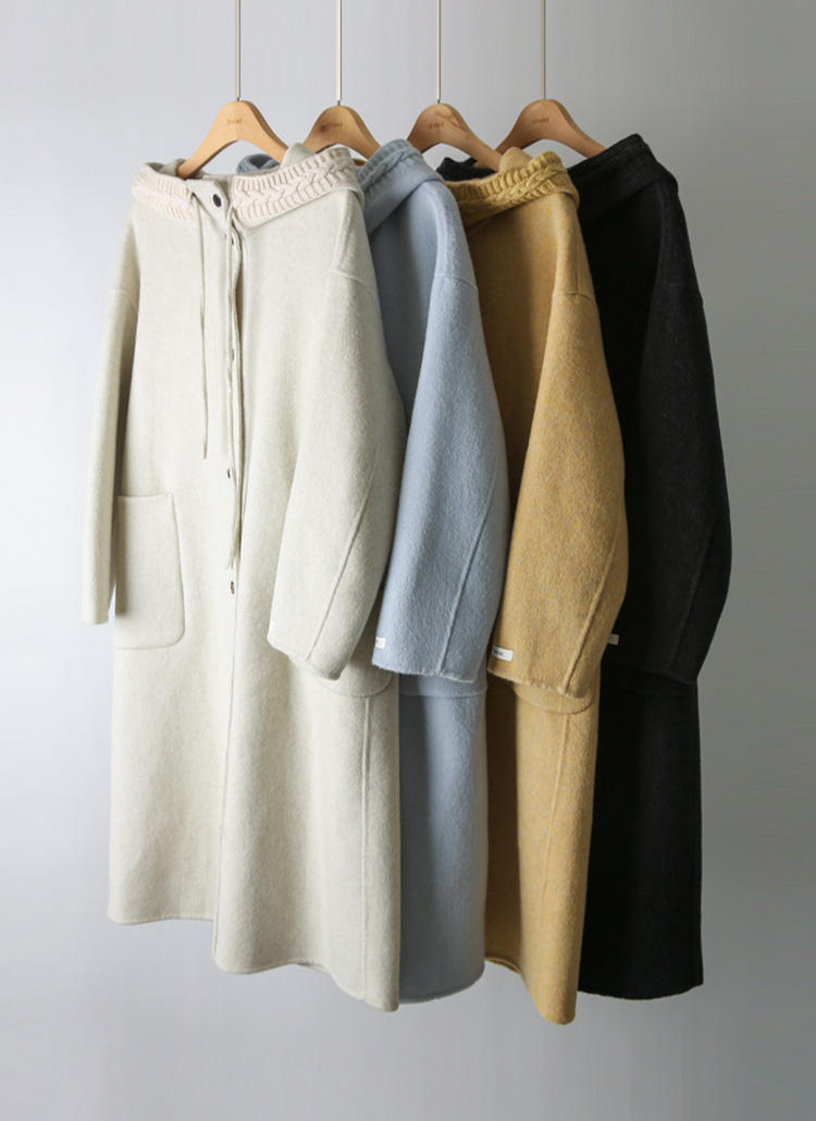 페이블 포근 울 블렌딩 꽈배기 니트 트리밍 하이넥 후드 핸드메이드 롱 코트