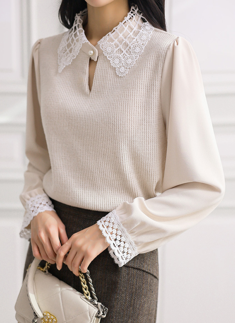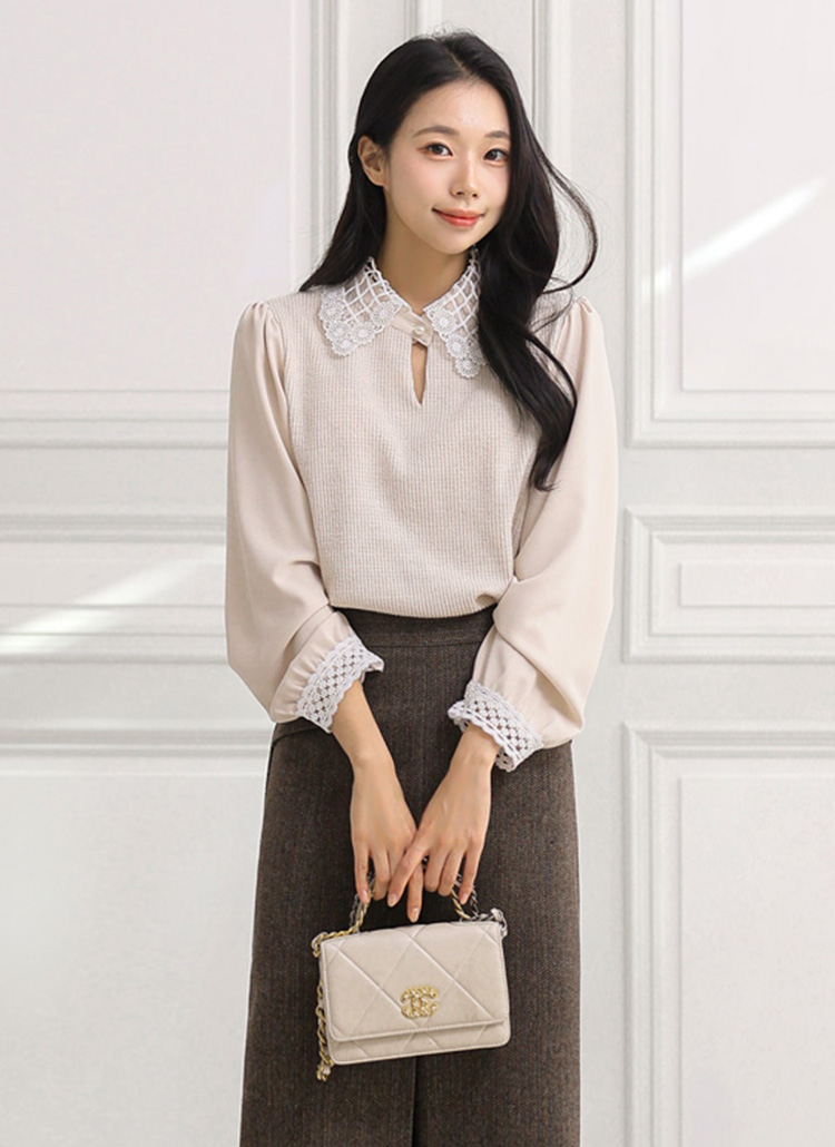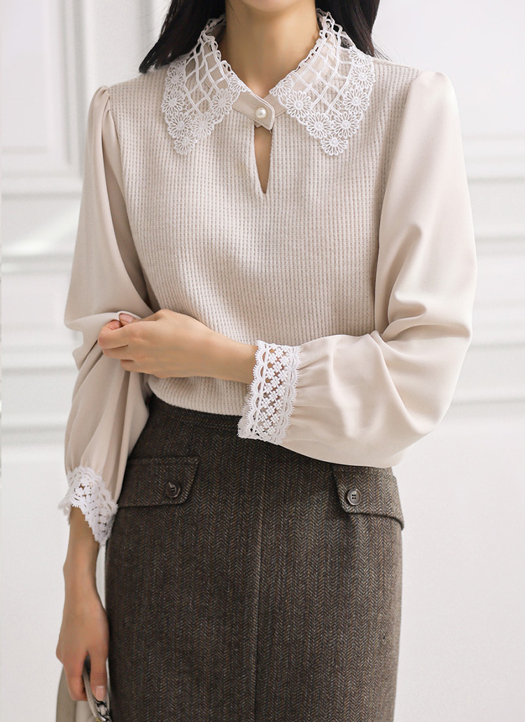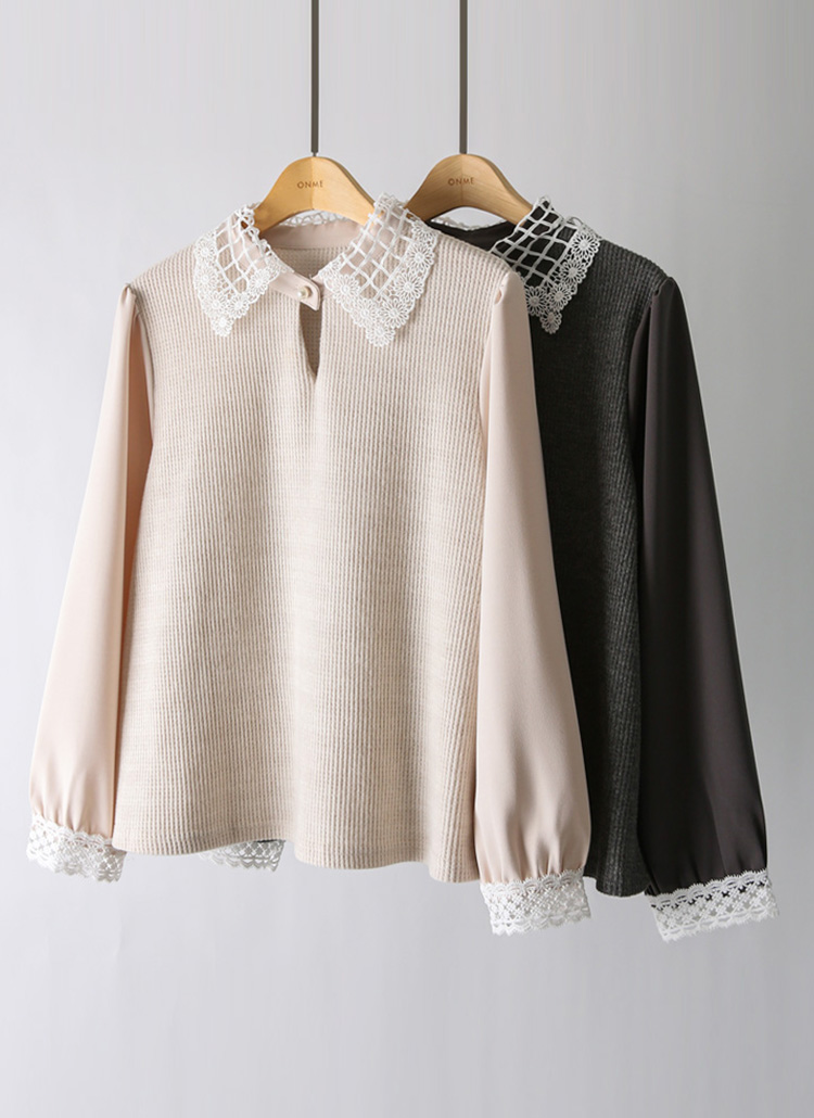 도레프 레이스 카라 와플 니트 레이어드 블라우스