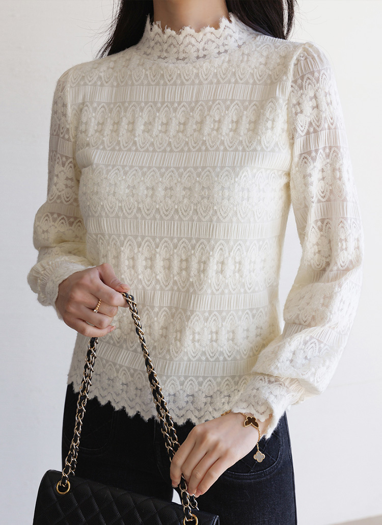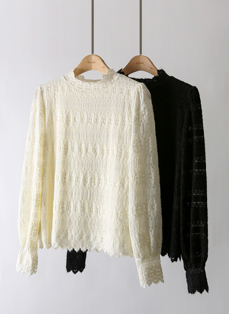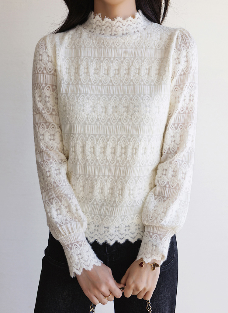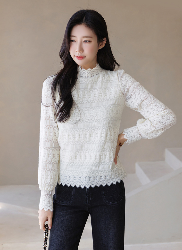 마레인 에스닉 레이스 속 기모 안감 반 하이넥 블라우스