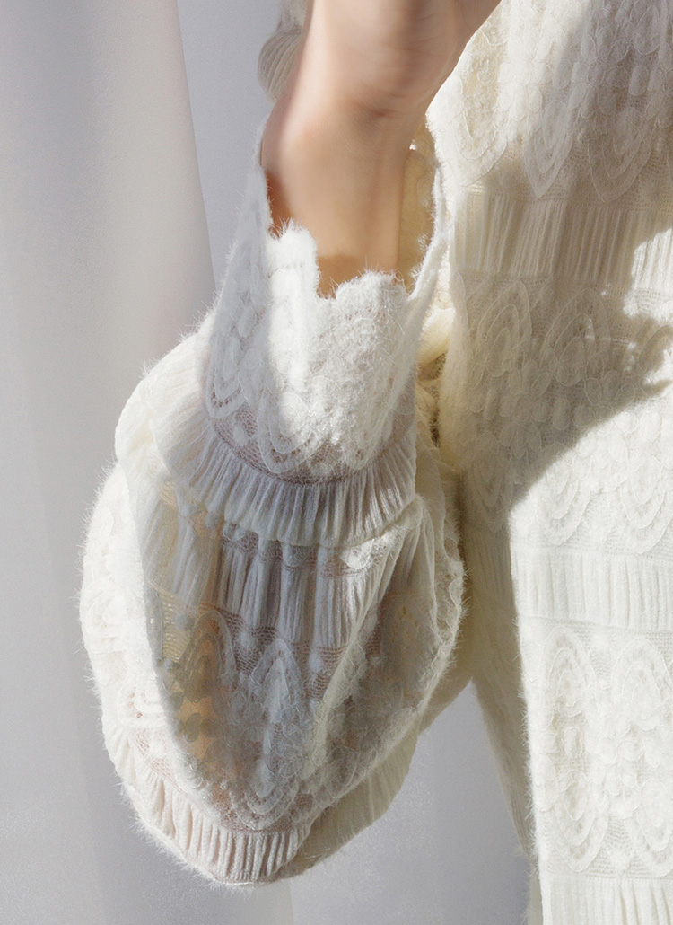 반하이넥과 소매단 밑단에는 스캘럽 라인을 섬세하게 살려 마감해