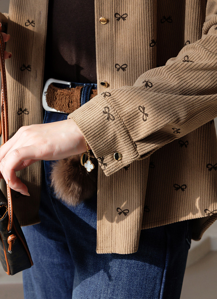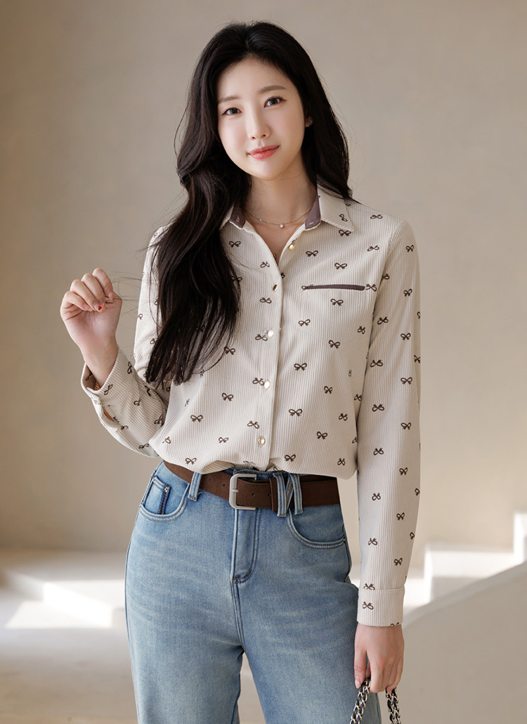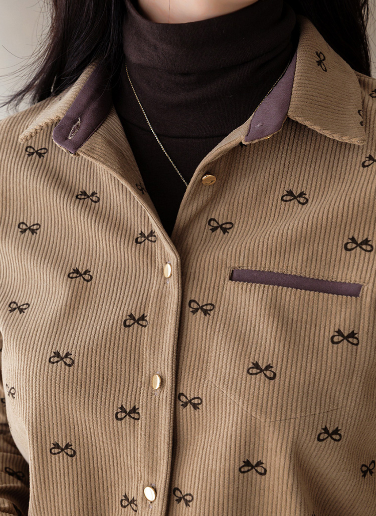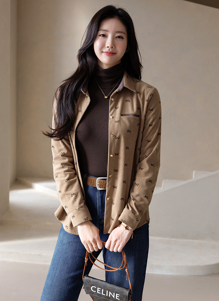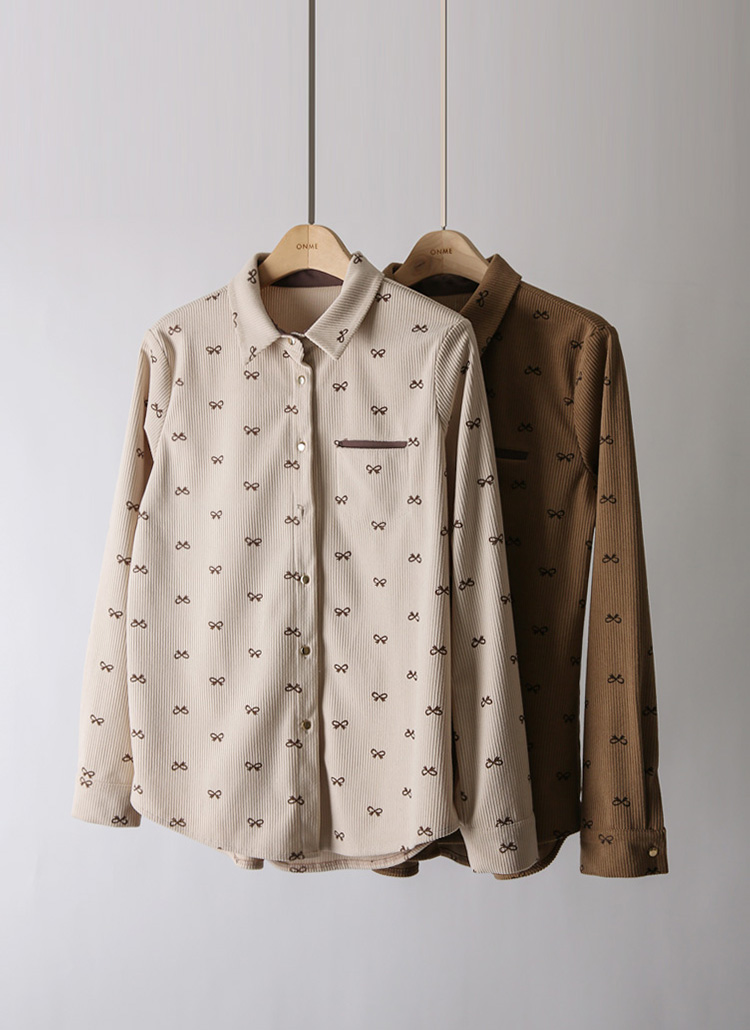 [LouisAngel] 베이드 리본 프린팅 스웨이드 배색 코듀로이 셔츠 블라우스