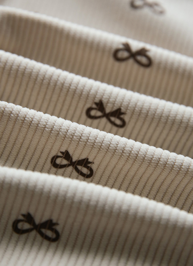 잔잔하게 더해진 미니 리본 프린팅이 룩에 은은한 포인트를 더해주어